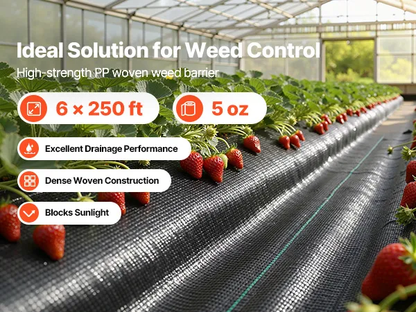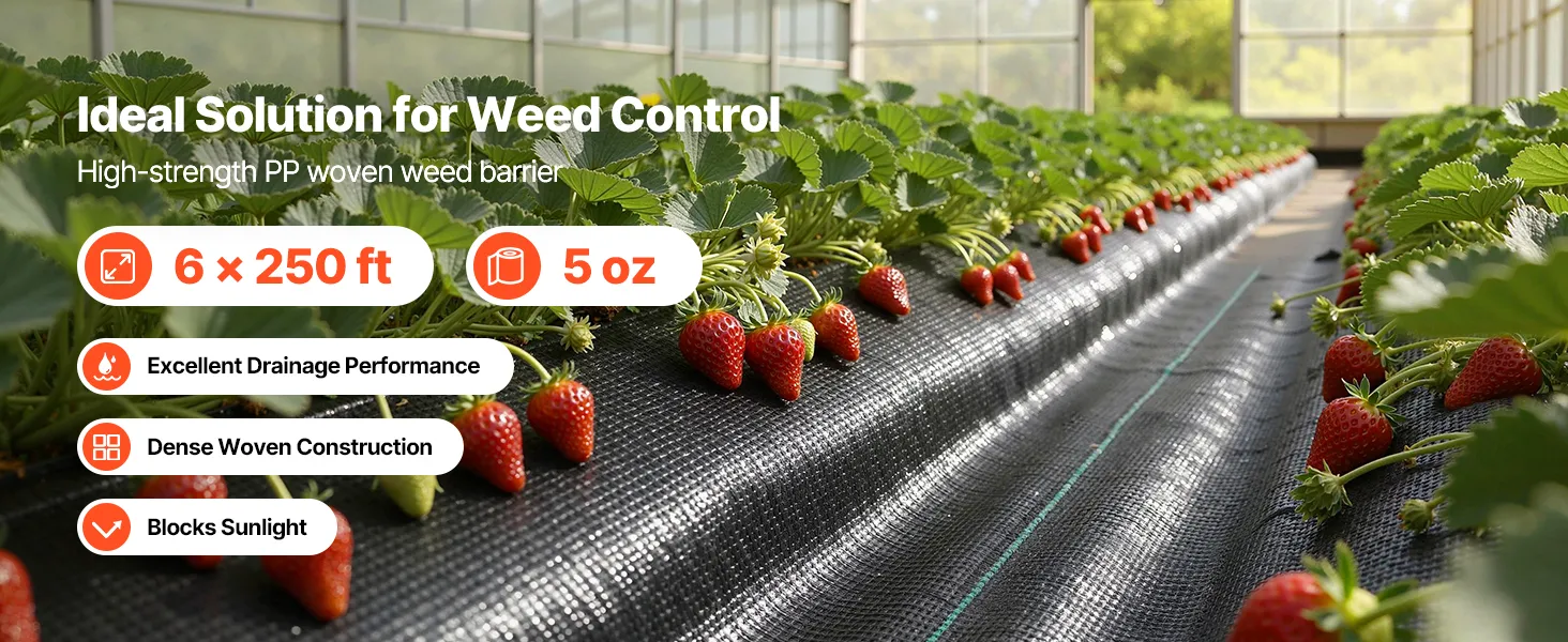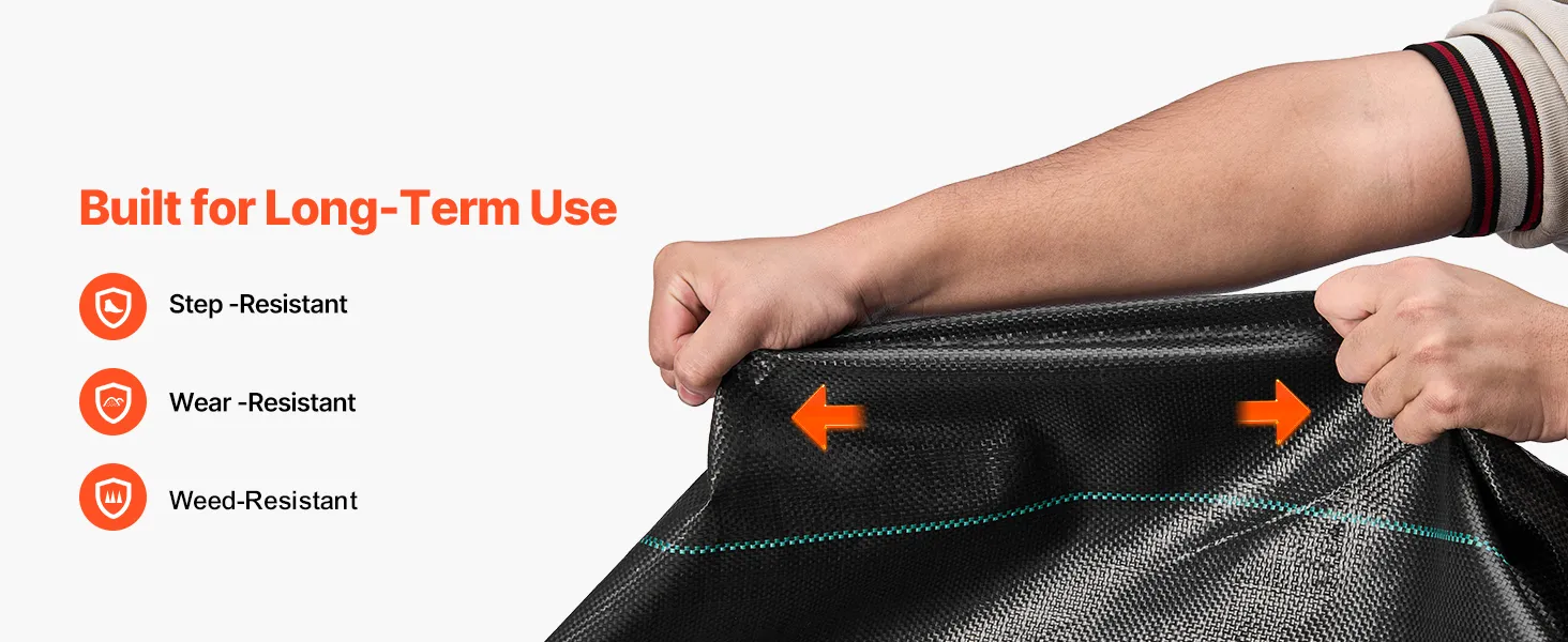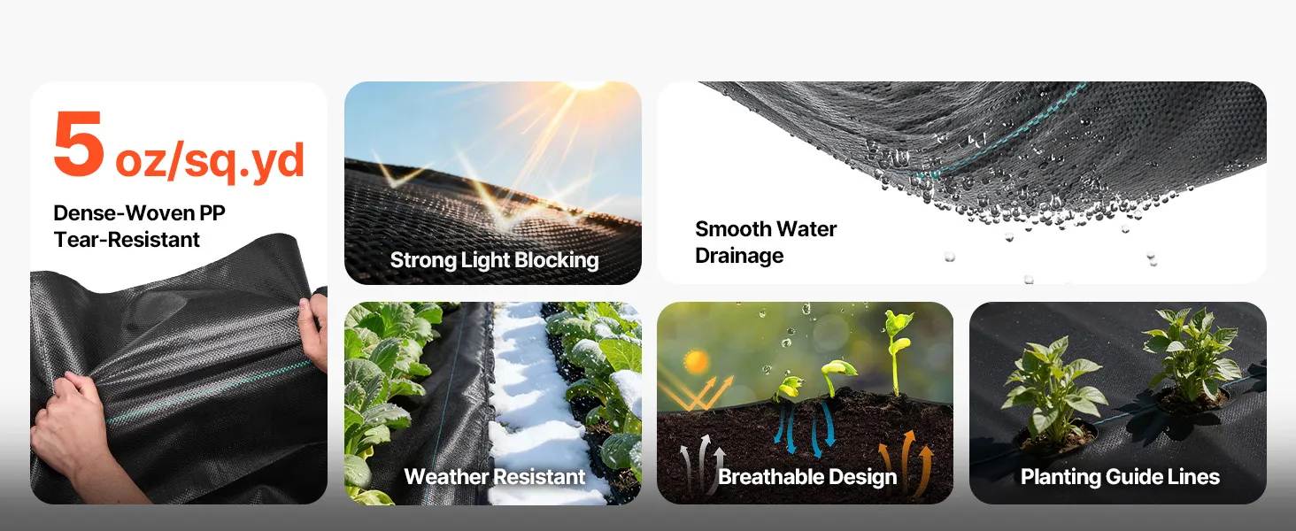 Evenwichtige luchtcirculatie: Dankzij het PP-weefsel met gelijkmatige micro-openingen laat dit VEVOR-onkruidbestrijdingsdoek water, lucht en voedingsstoffen vrij door de grond circuleren. Het voorkomt wateroverlast en bodemverdichting en bevordert de lucht- en watercirculatie, waardoor de wortelgroei van planten optimaal wordt ondersteund.