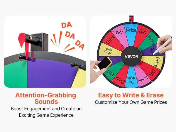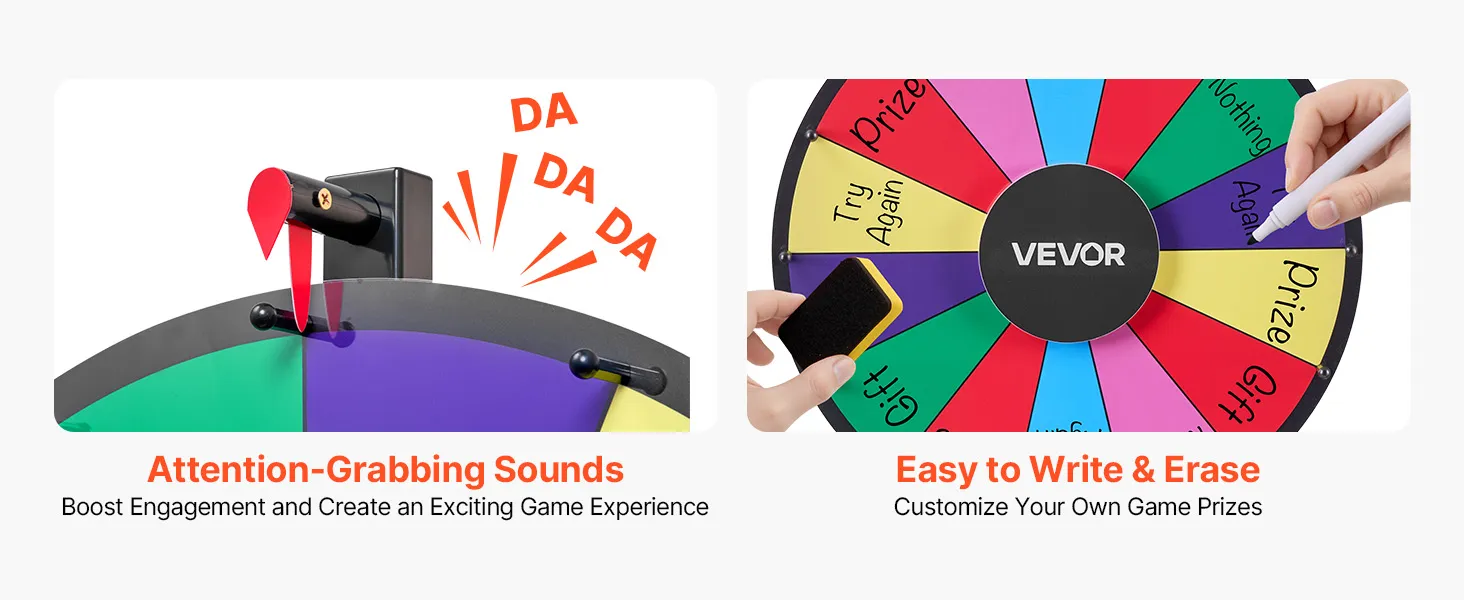 Aanpasbaar en bewerkbaar: 14 vakjes om je spellen te personaliseren. Een vloeiend, herschrijfbaar bord met felle kleuren zorgt ervoor dat je prijzenwiel op elk evenement opvalt.