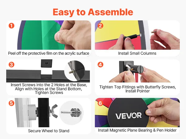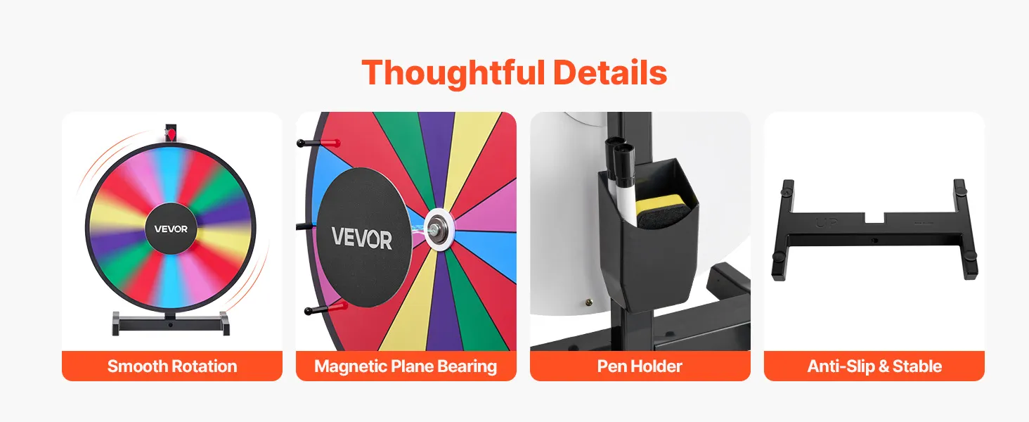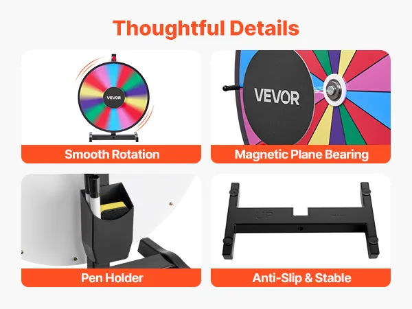De soepele rotatie met nauwkeurige lagers en een antislipvoet zorgen voor stabiel en veilig gebruik. Het draaiende rad van fortuin wordt geleverd met een penhouder voor eenvoudige opberging.
