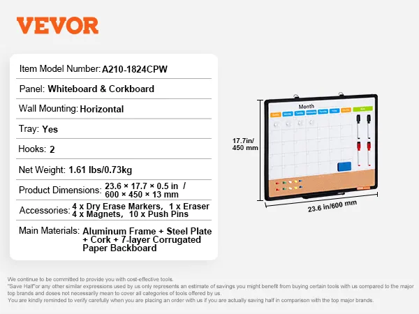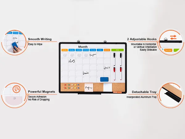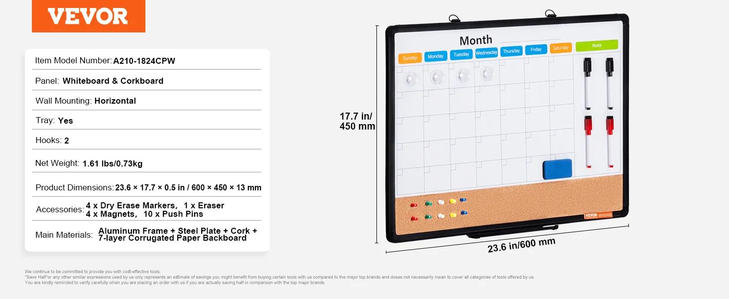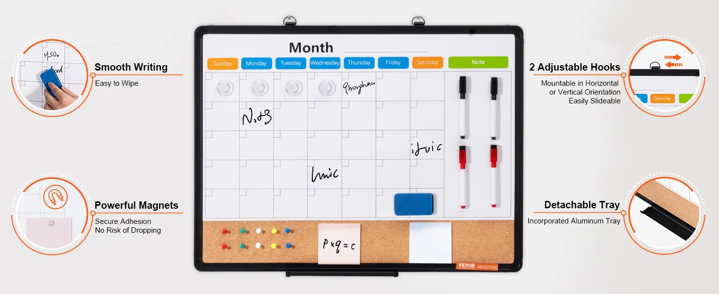 Smooth Writing and Easy Erasing: Our magnetic whiteboard has a smooth, scratch-resistant surface that works well with dry-erase markers, making writing and erasing easy. The cork area is upgraded with 7 layers of corrugated paper and a galvanized sheet, preventing bulging and keeping items securely pinned. The included dry-erase marker wipes off cleanly, and the bottom tray keeps your markers and erasers handy, saving time.
