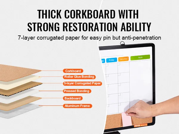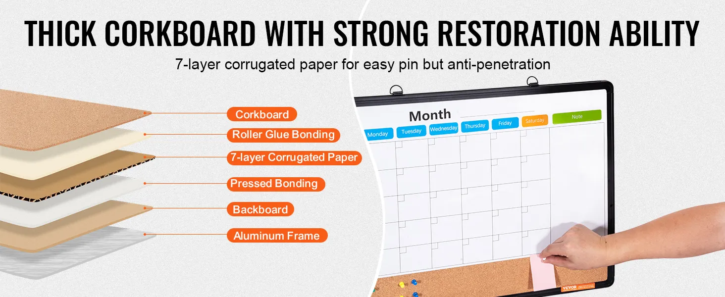 Upgraded Aluminum Frame:This upgraded aluminum frame of the cork board features screw connections at the corners and is wrapped with rounded plastic edges to ensure both sturdiness and safety without sharp edges. The aluminum frame is lighter, thinner, and more durable, making the entire product easier to move from room to room. Its elegant aluminum frame design is perfect for adding a touch of sophistication to any space.