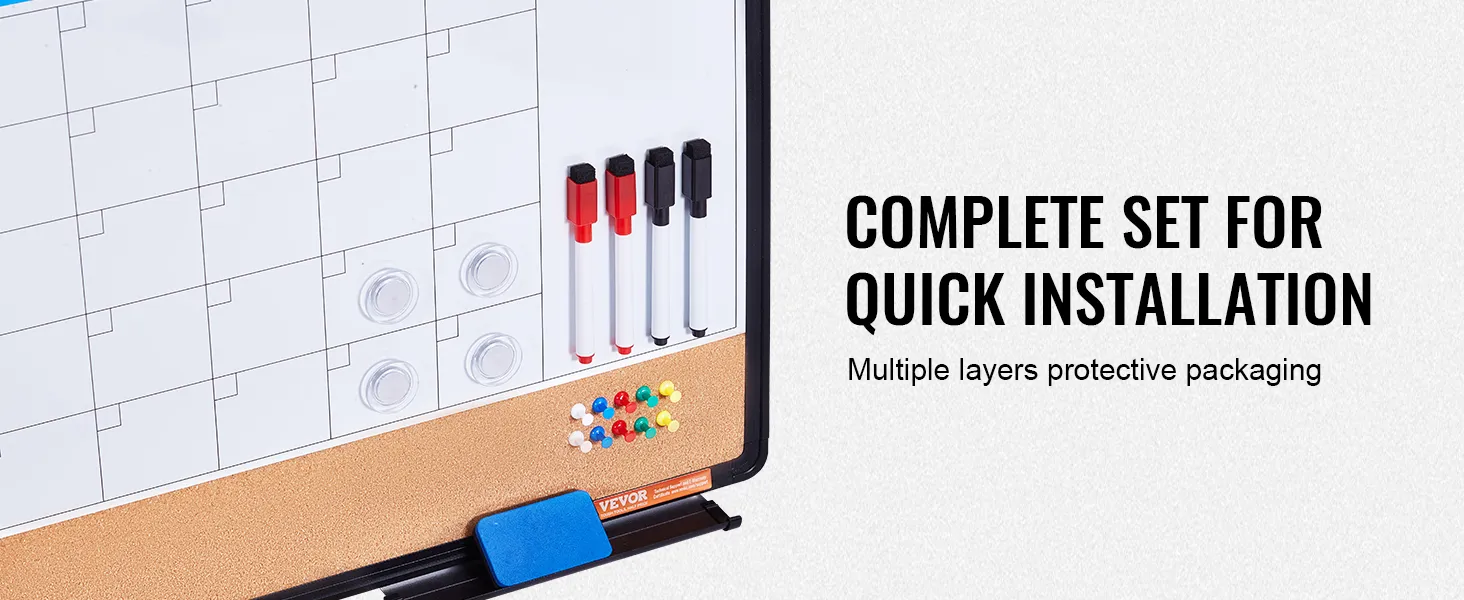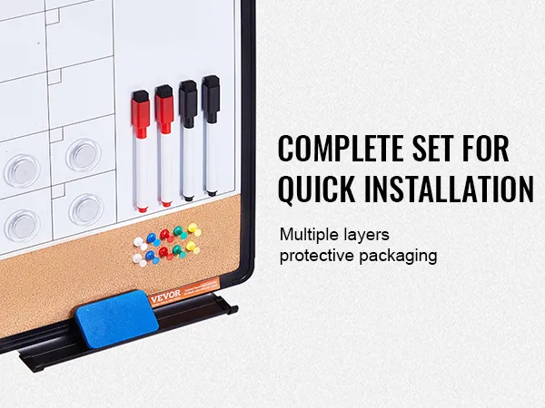 Complete Accessories and Secure Packaging: This notice board comes with everything you need: 4 colorful dry-erase markers, 1 eraser, 4 magnets, and 10 push pins. The combination board is securely packed with 5 layers of corrugated paper, honeycomb strips around the edges, and a cover plate to ensure it arrives in perfect condition, without damage. No need for additional purchases or waiting—just unpack and use the complete set right away.