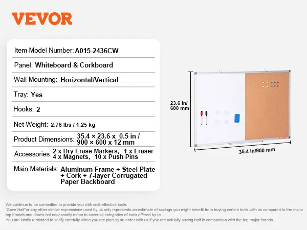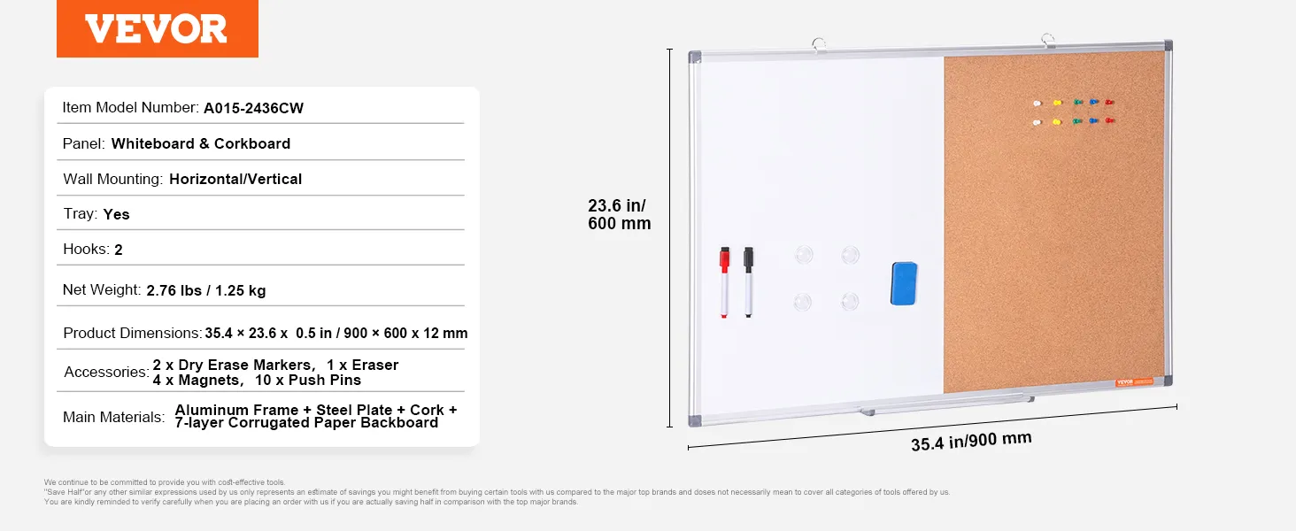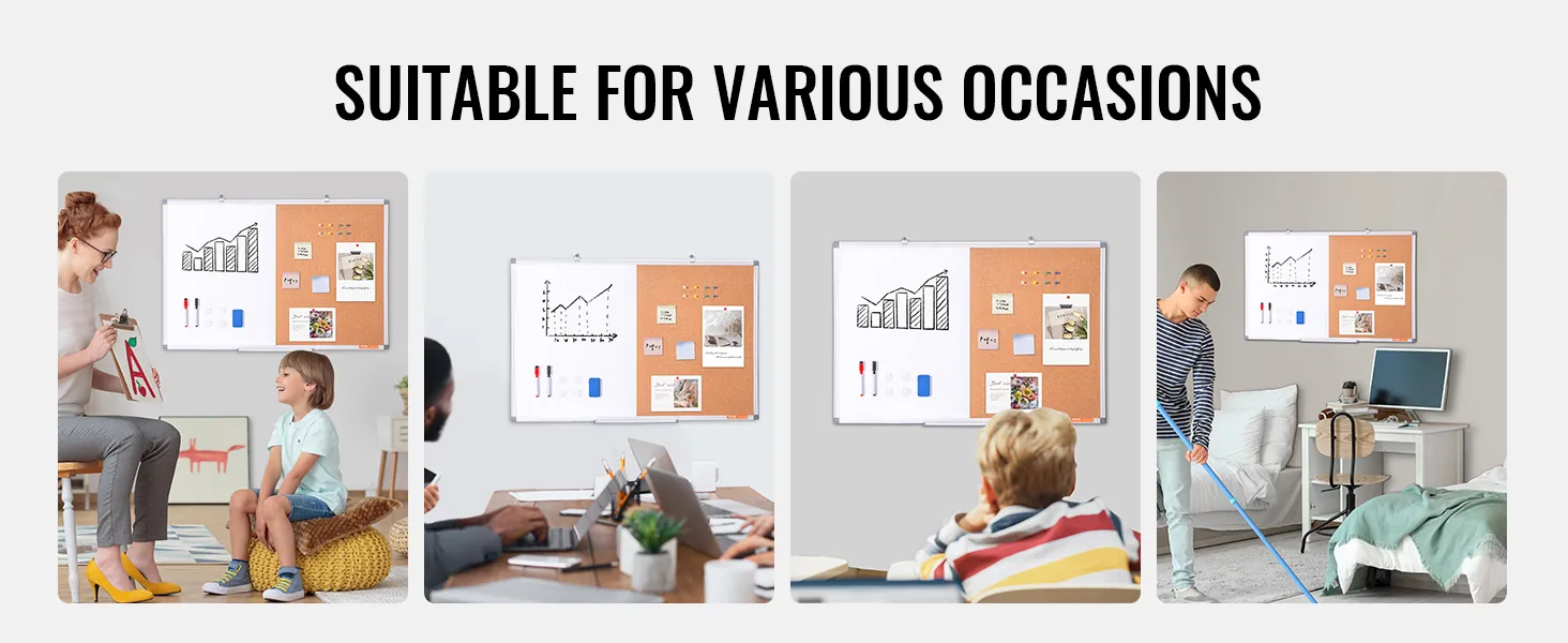 Multi-Functional Combination Board: Our combination board measures 36 x 24 in and includes a note section and a cork area. This integrated design helps you keep everything you need in one place. The cork area is ideal for pinning photos, memos, and other documents, while the note section is perfect for jotting down important messages and work reminders. It's an ideal choice for managing daily tasks and solving problems efficiently.