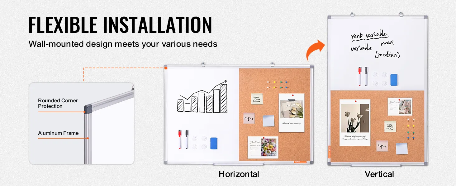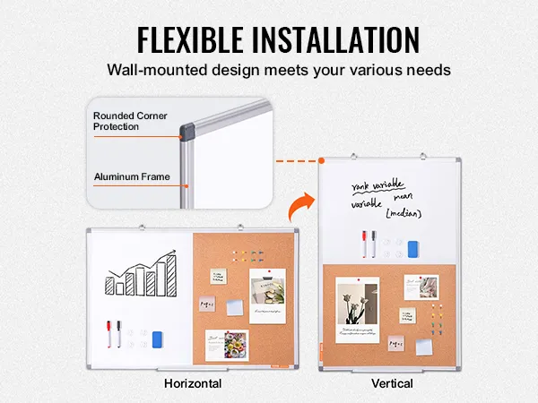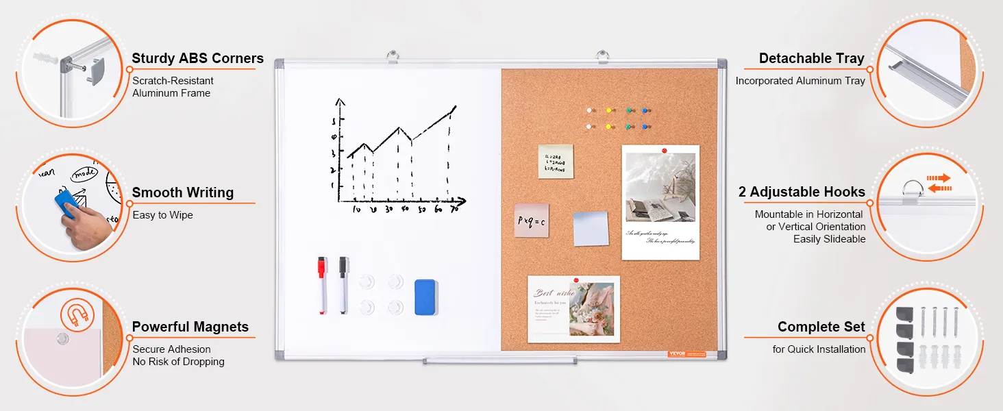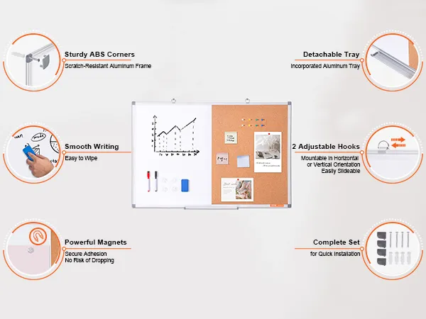 Smooth Writing and Easy Erasing: Our magnetic whiteboard has a smooth, scratch-resistant surface that works well with dry-erase markers, making writing and erasing easy. The cork area is upgraded with 7 layers of corrugated paper and a galvanized sheet, preventing bulging and keeping items securely pinned. The included dry-erase marker wipes off cleanly, and the bottom tray keeps your markers and erasers handy, saving time.