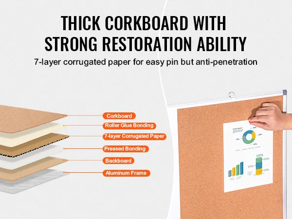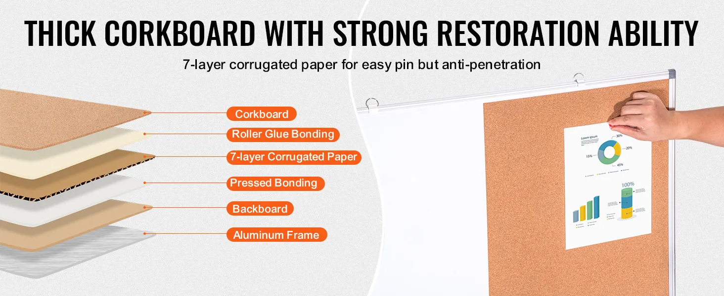 The cork area is upgraded with 7 layers of corrugated paper, reinforced to prevent bulging and ensure a sleek appearance. The aluminum frame has rounded edges and is securely assembled with screws.