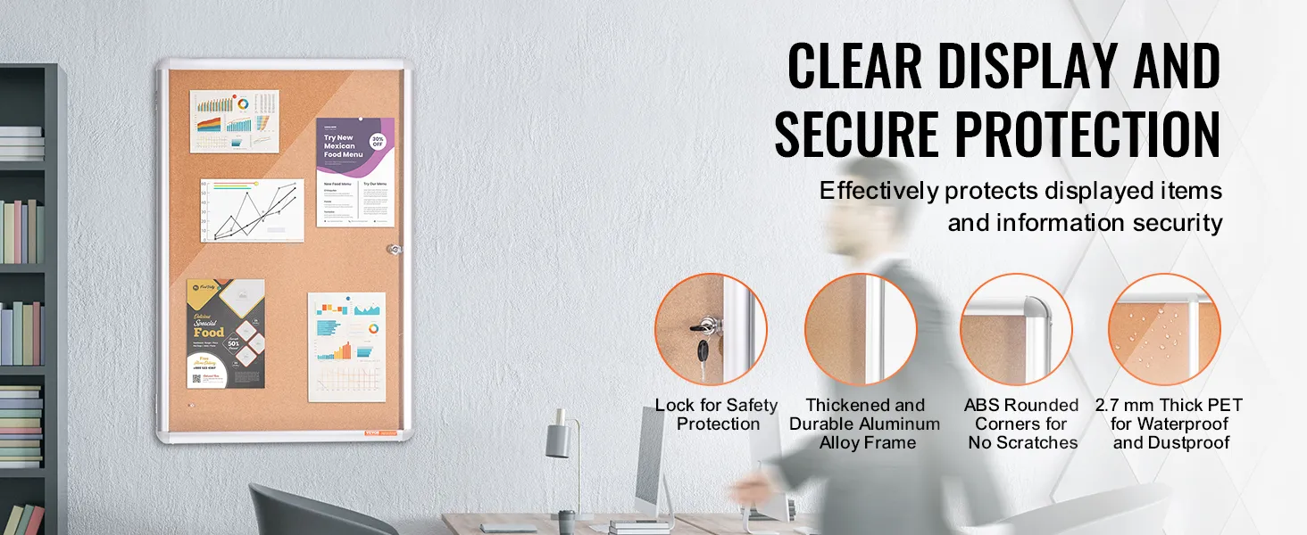 This notice board features a 2.7mm thick PET protective door encased in a sturdy aluminum frame. It includes a locking mechanism with a key to ensure your announcements and notices are securely displayed while remaining safe.