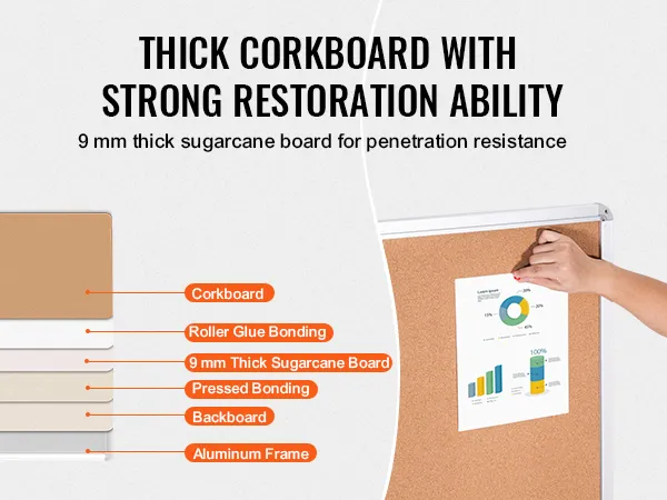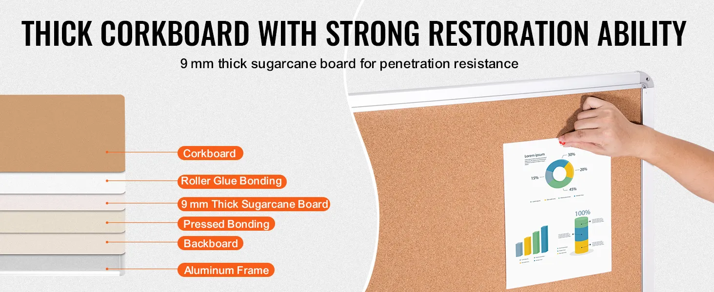 High-Density Cork Board: The cork area is upgraded with a 9mm thick fiberboard core to prevent unsightly pin holes even with long-term use. It’s reinforced with glue and press plates, providing a more attractive and durable surface that keeps pins secure and prevents bulging and perforation.