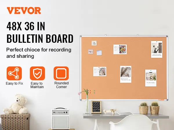 The bulletin board is available in sizes 48" x 36". The ample space allows you to pin photos, memos, and other materials to showcase your ideas, artwork, schedules, etc. Perfect for home or office use.
