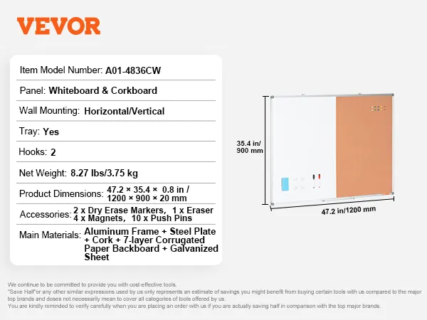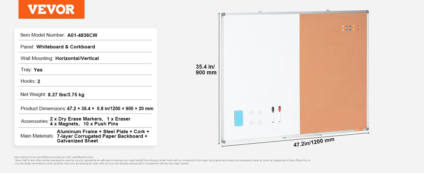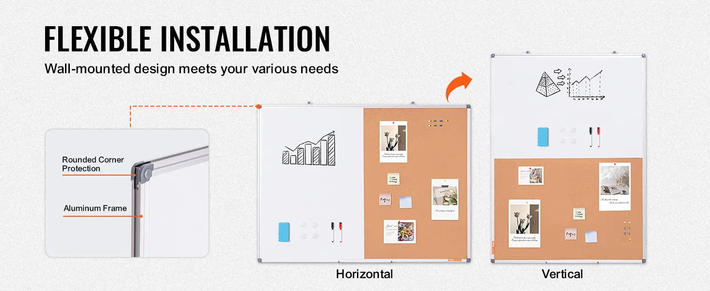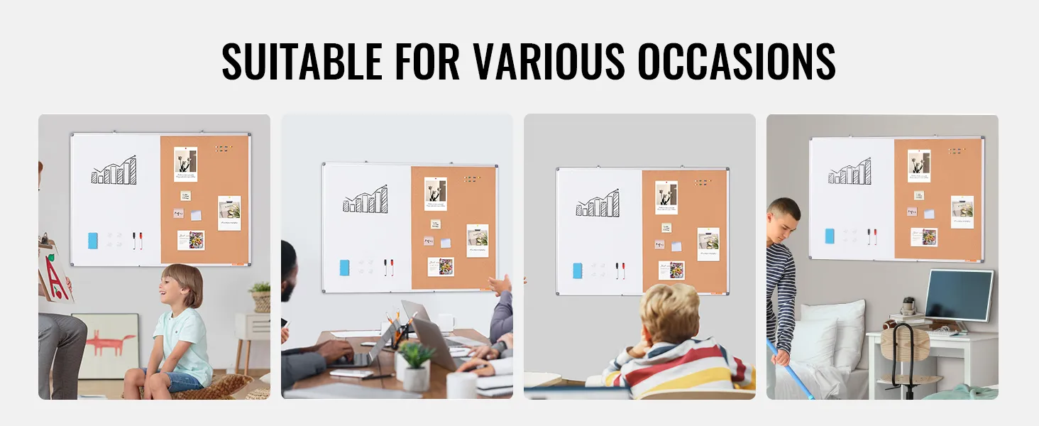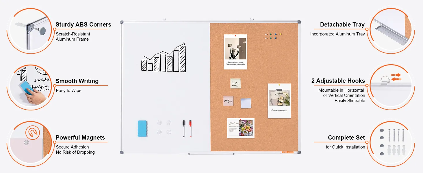 Multi-Functional Combination Board: Our combination board measures 48 x 36 in and includes a note section and a cork area. This integrated design helps you keep everything you need in one place. The cork area is ideal for pinning photos, memos, and other documents, while the note section is perfect for jotting down important messages and work reminders. It's an ideal choice for managing daily tasks and solving problems efficiently.