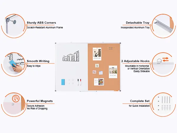 Smooth Writing and Easy Erasing: Our magnetic whiteboard has a smooth, scratch-resistant surface that works well with dry-erase markers, making writing and erasing easy. The cork area is upgraded with 7 layers of corrugated paper and a galvanized sheet, preventing bulging and keeping items securely pinned. The included dry-erase marker wipes off cleanly, and the bottom tray keeps your markers and erasers handy, saving time.