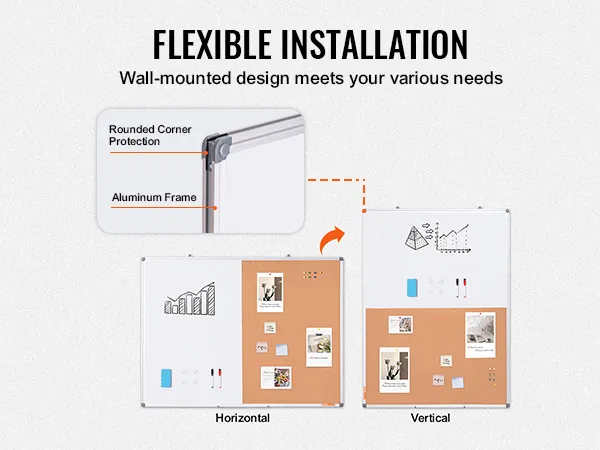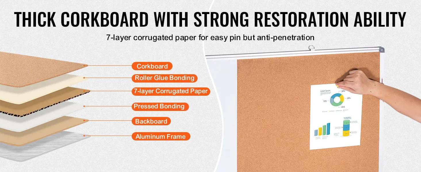 Upgraded Aluminum Frame:This upgraded aluminum frame of the cork board features screw connections at the corners and is wrapped with rounded plastic edges to ensure both sturdiness and safety without sharp edges. The aluminum frame is lighter, thinner, and more durable, making the entire product easier to move from room to room. Its elegant aluminum frame design is perfect for adding a touch of sophistication to any space.