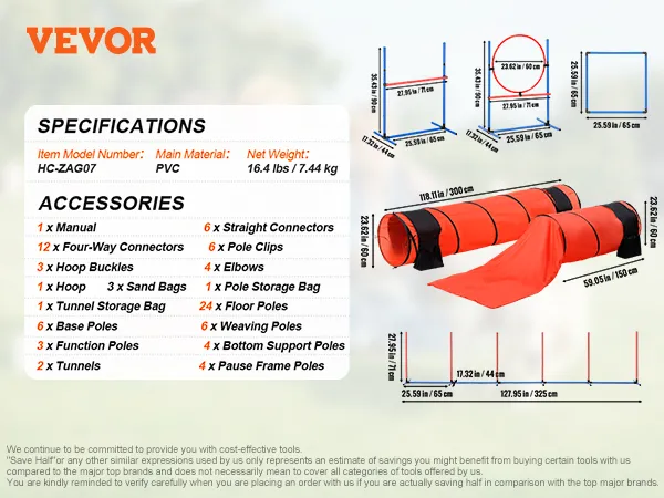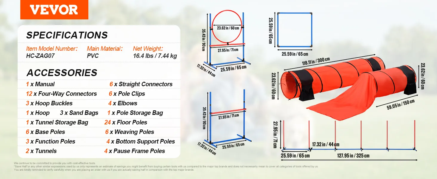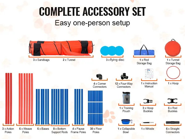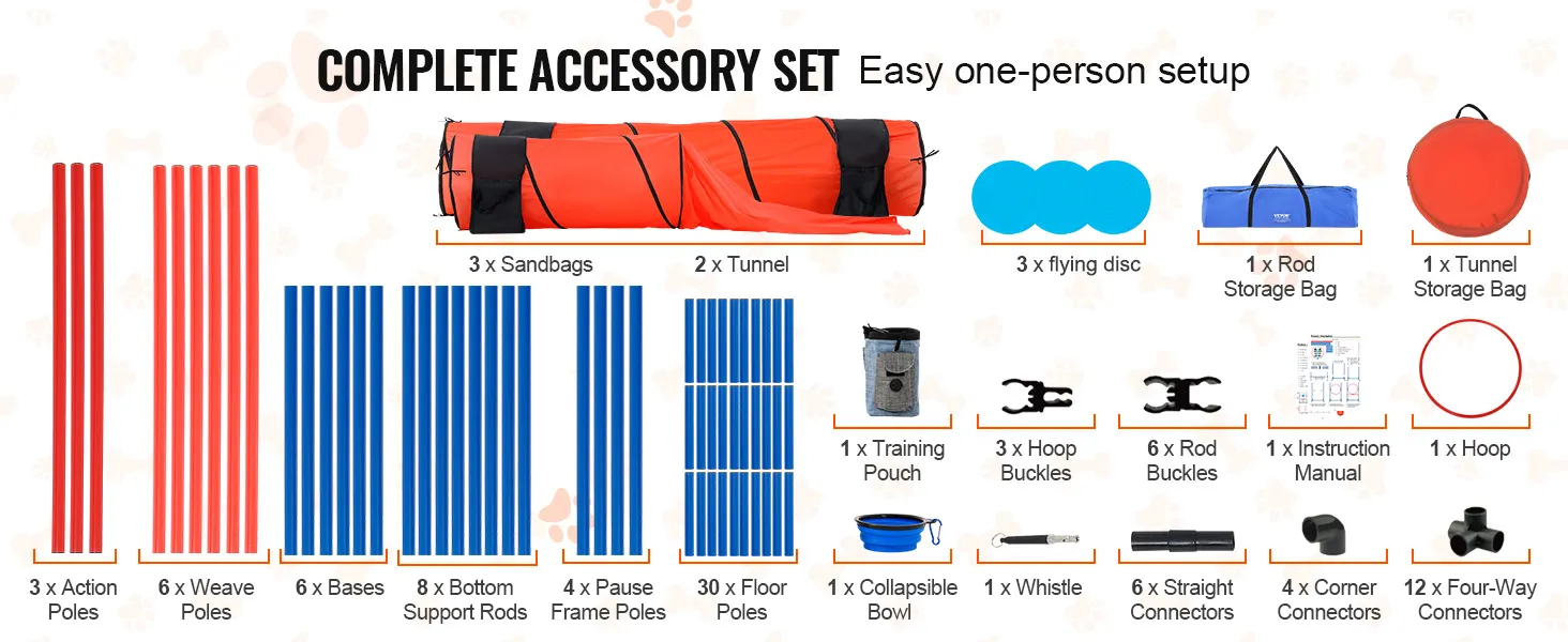 What’s Included: Instruction manual x1, training bag x1, whistle x1, folding bowl x1, jump ring x1, sandbags x3, pole and tunnel storage bags x2, weaving poles x6, tunnels x2, pause box poles x4. Everything you need for a complete agility training setup, ready for immediate use and fun.