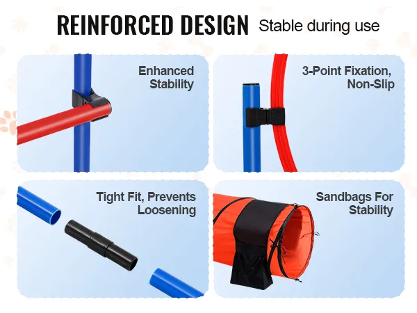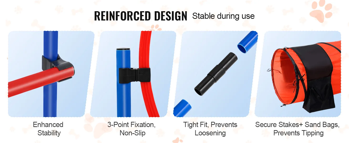 Premium and Durable: Made from sturdy PVC, the bars are stable and resistant to deformation. The jump ring features reinforced rods and a 3-point Velcro system for minimal wobble. The foldable tunnels are crafted from tear-resistant polyester with side pockets for added stability.