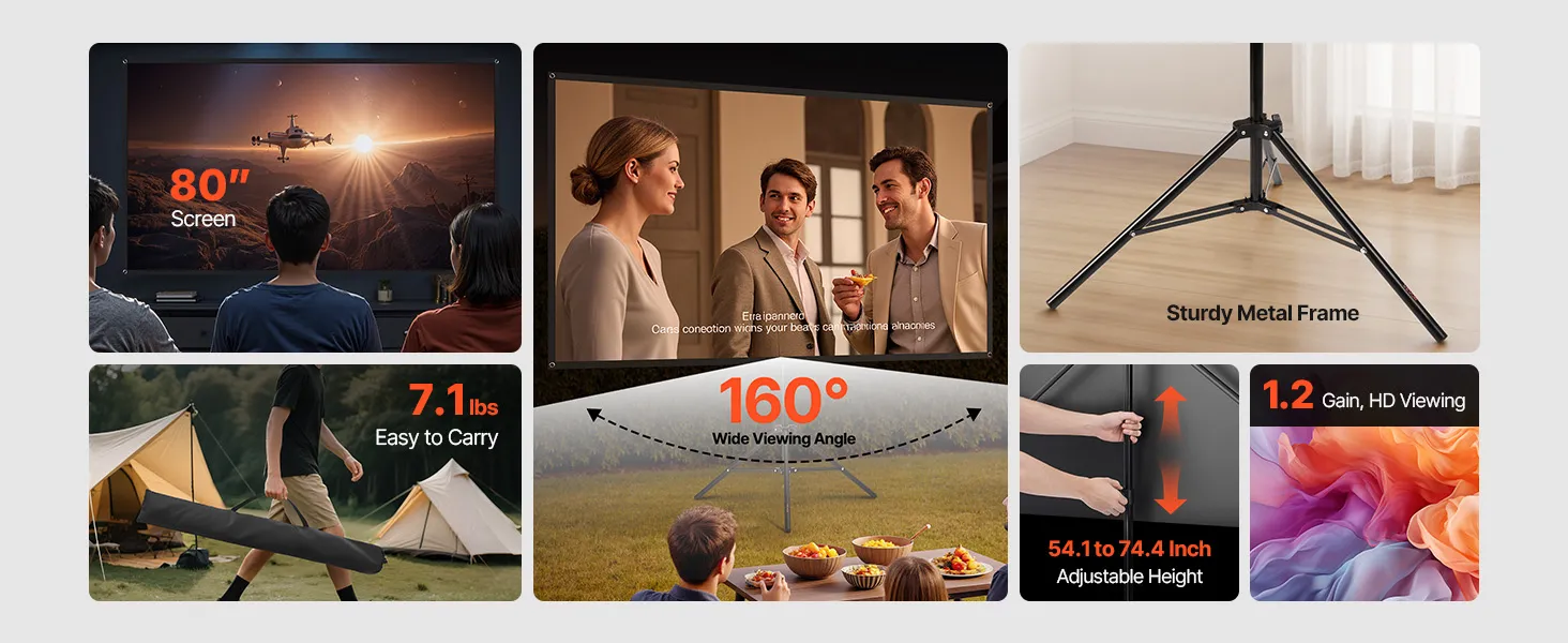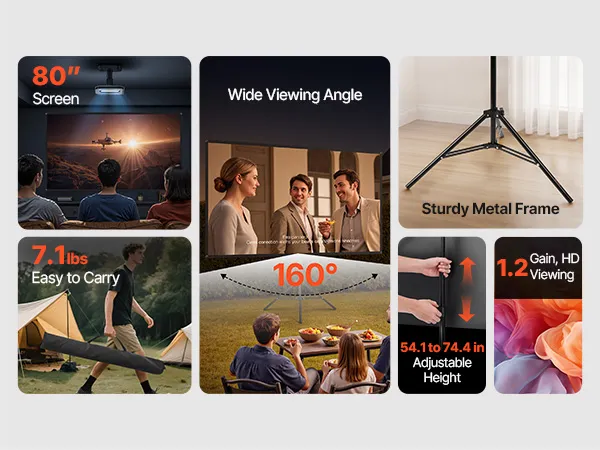 Quick Setup & Storage: Assemble the screen in just 5 minutes with convenient height adjustment. The 160° wide viewing angle accommodates multiple viewers without crowding. Weighing only 7.1 lbs and including a carry bag, it enables easy storage and transport
