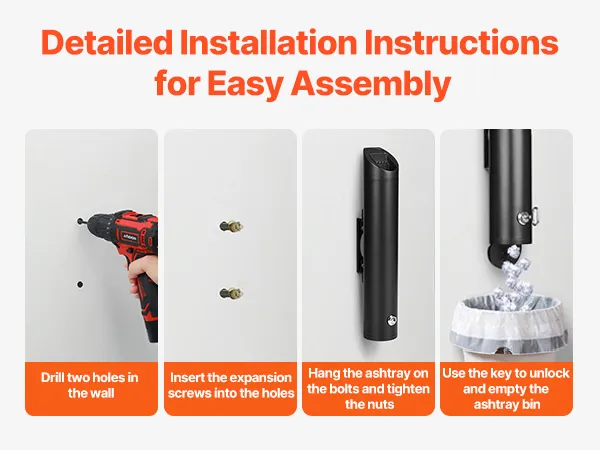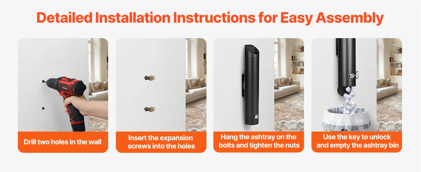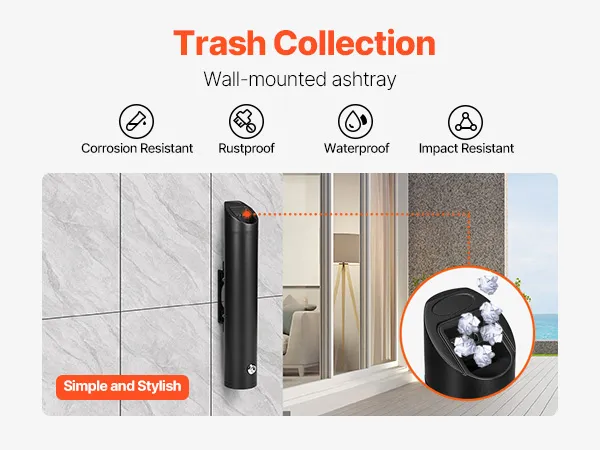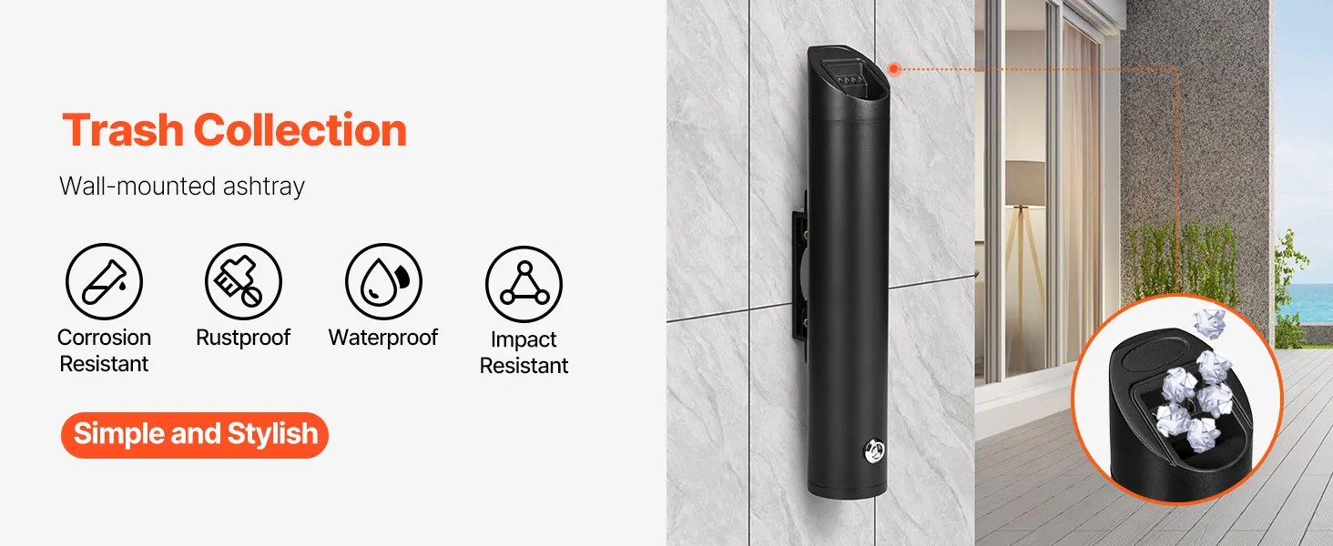 • Compact Wall-Mounted Design: The wall-mounted design saves space, making it ideal for tight spaces. It’s easy to install by simply drilling holes in the wall, offering both a practical and aesthetically pleasing solution for your cigarette disposal container.