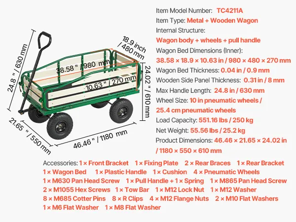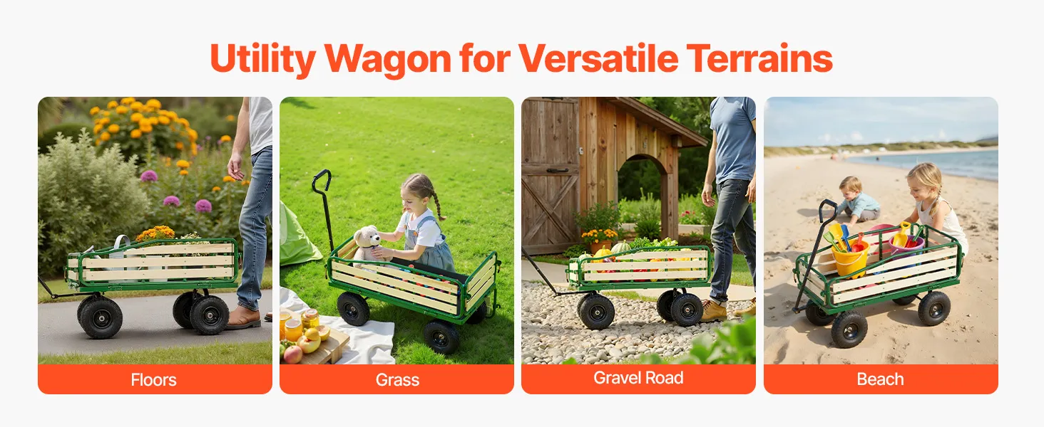Veelzijdig ontwerp: Dankzij de verstelbare en afneembare zijpanelen kan de kinderkar naar wens worden aangepast. Met afmetingen van 1180 x 550 x 610 mm (L x B x H) is hij ruim genoeg voor kinderen om in te spelen, speelgoed en boeken op te bergen, of tuingereedschap en landbouwproducten te vervoeren.