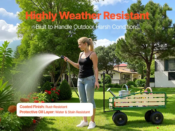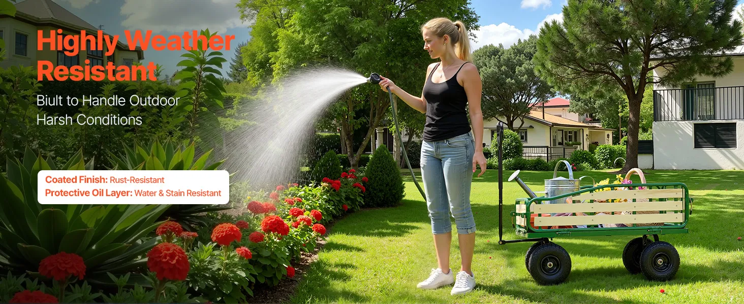 Deze kinderkar is gemaakt van koolstofstaal en hardhout en is behandeld met een coating en olie voor weerbestendigheid. Hij is bestand tegen regen, zonlicht en ruwe omstandigheden, is roest-, water- en vuilafstotend en vereist daardoor aanzienlijk minder onderhoud.