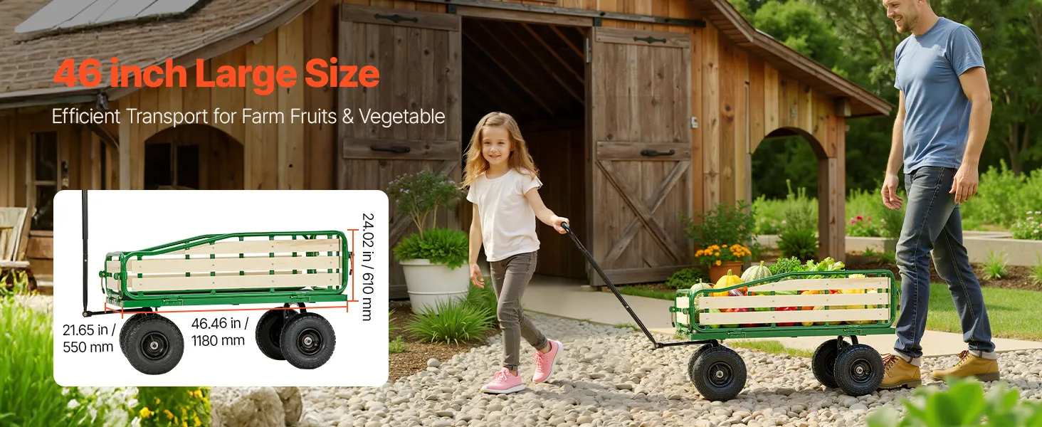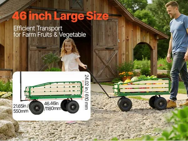 Met royale afmetingen van 1180 x 550 x 610 mm (L x B x H) biedt deze kindvriendelijke aanhanger voldoende ruimte voor tuingereedschap en meer. Geen gedoe meer met meerdere ritten – vervoer uw oogst snel en efficiënt terug naar de opslagruimte.