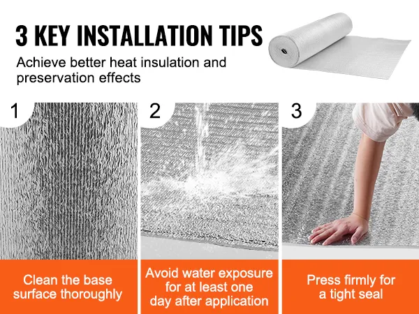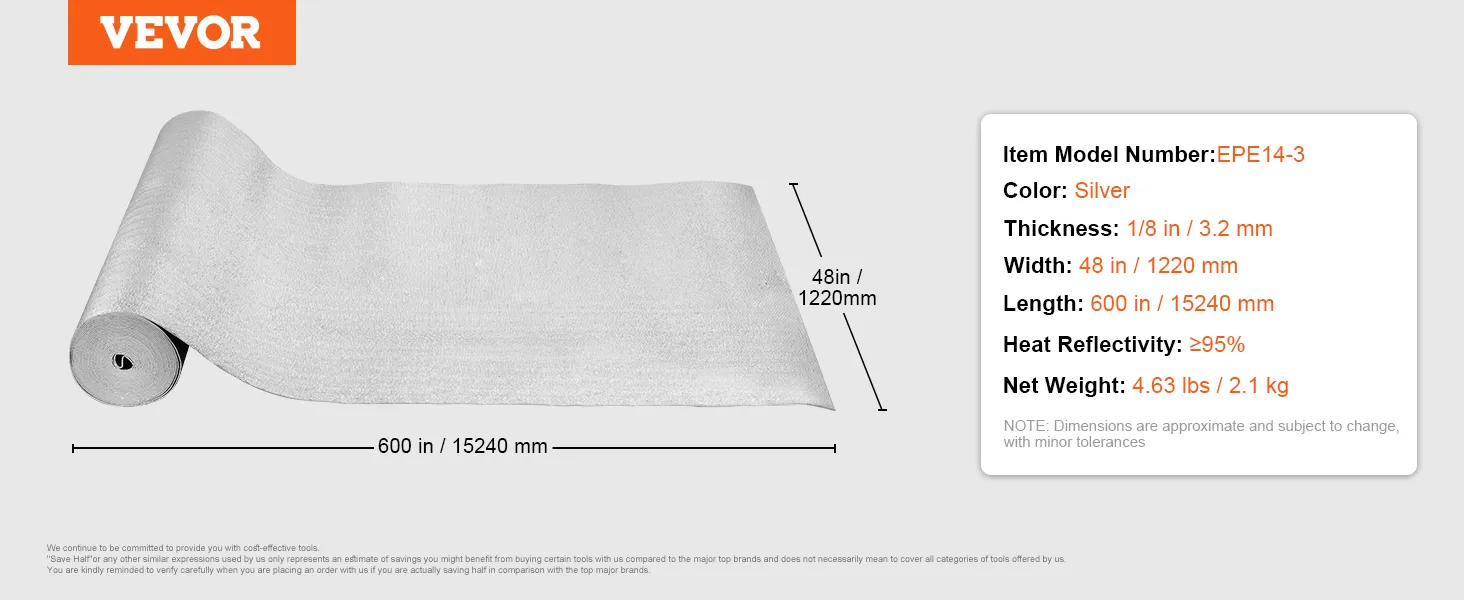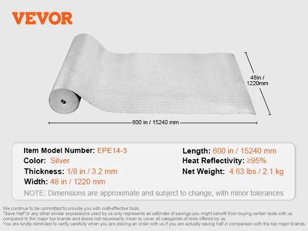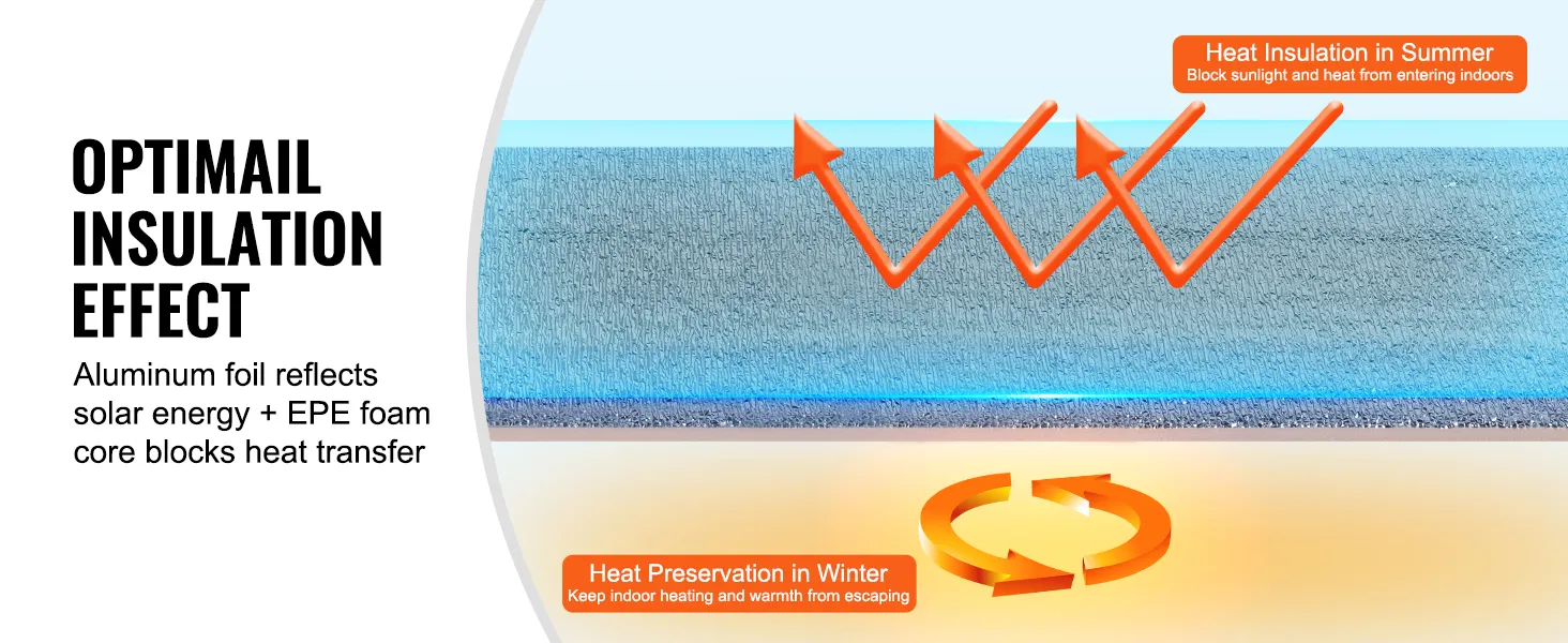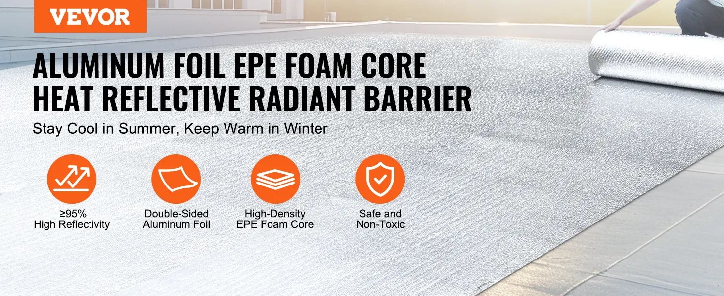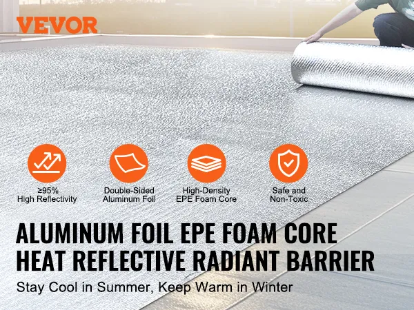 De isolatierol van VEVOR heeft een hoge reflectiviteit van ≥95% en is gemaakt van dubbel reflecterende aluminiumfolie en een kern van EPE-schuim met hoge dichtheid. Het blokkeert effectief zonlicht in de zomer en voorkomt warmteverlies binnenshuis in de winter.