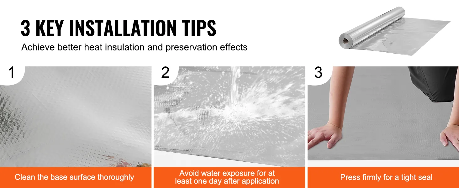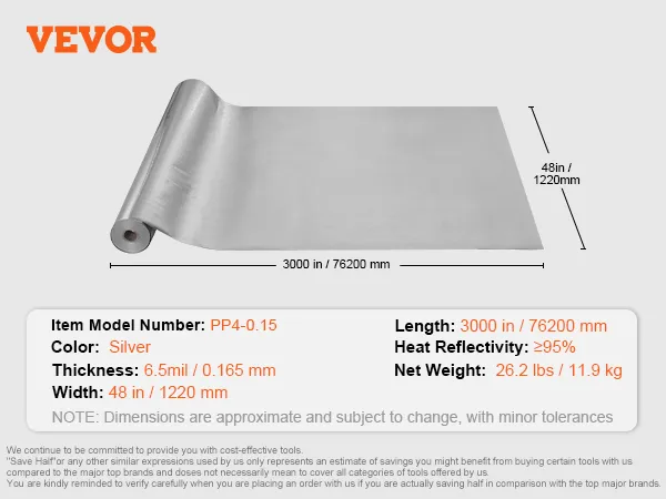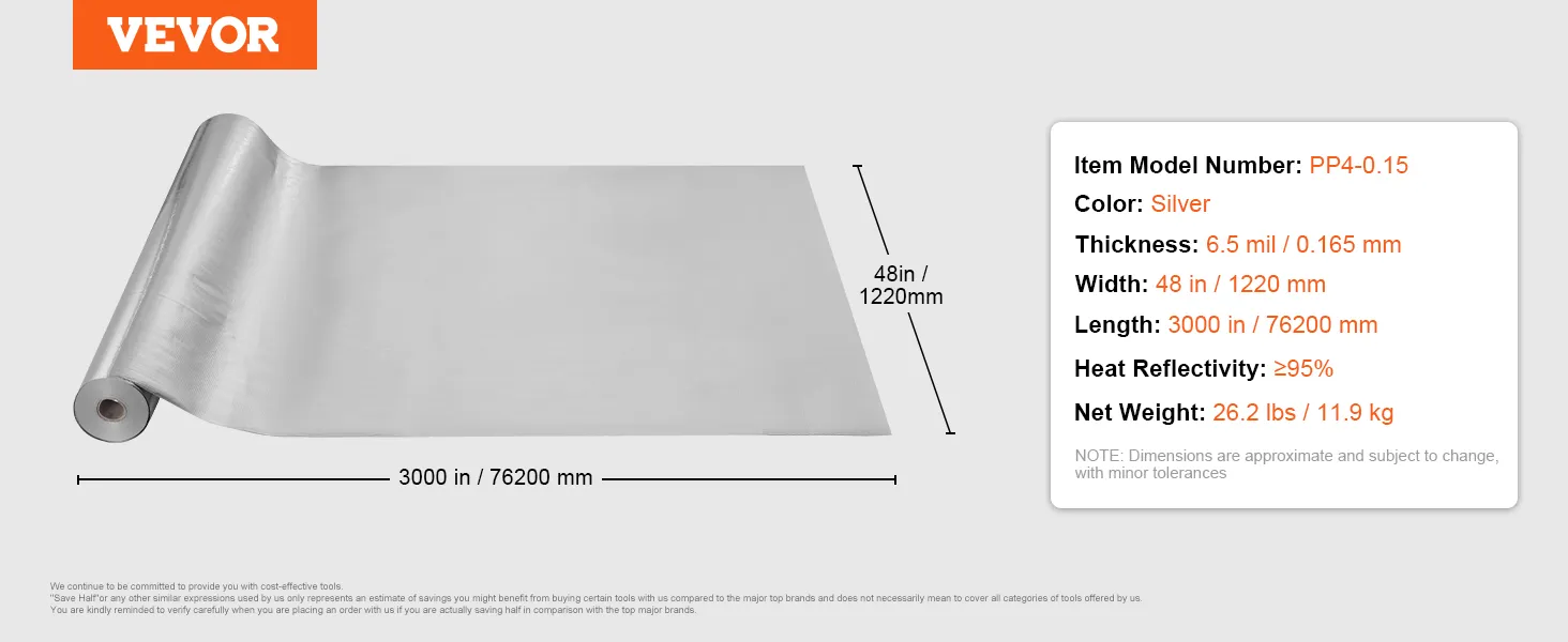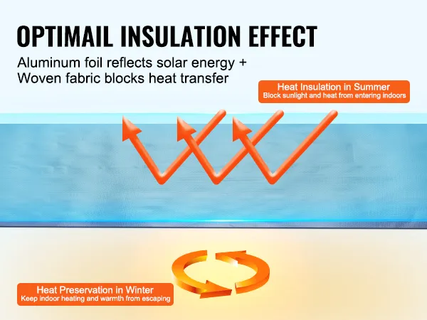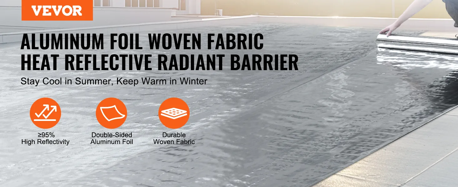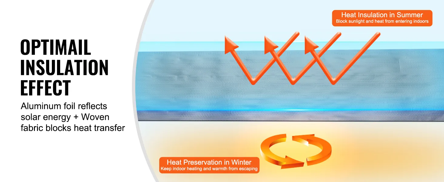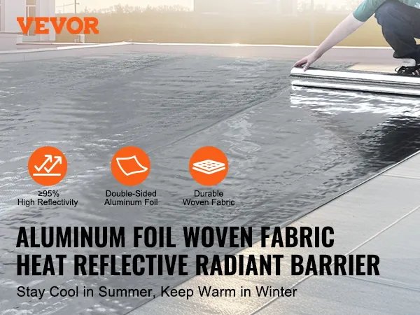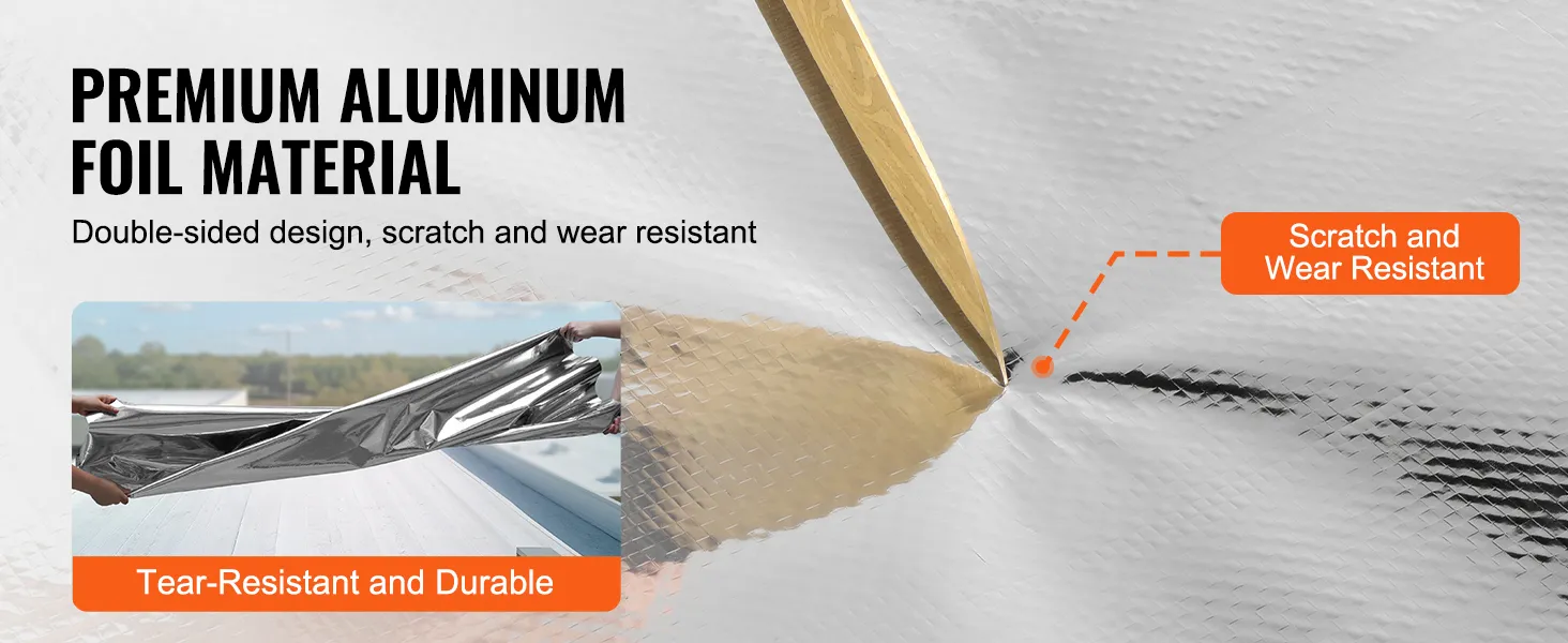 De isolatierol van VEVOR heeft een hoge reflectiviteit van ≥95% en is gemaakt van dubbel reflecterende aluminiumfolie en slijtvast PE-weefsel. Het blokkeert zonlicht in de zomer en voorkomt warmteverlies binnenshuis in de winter.