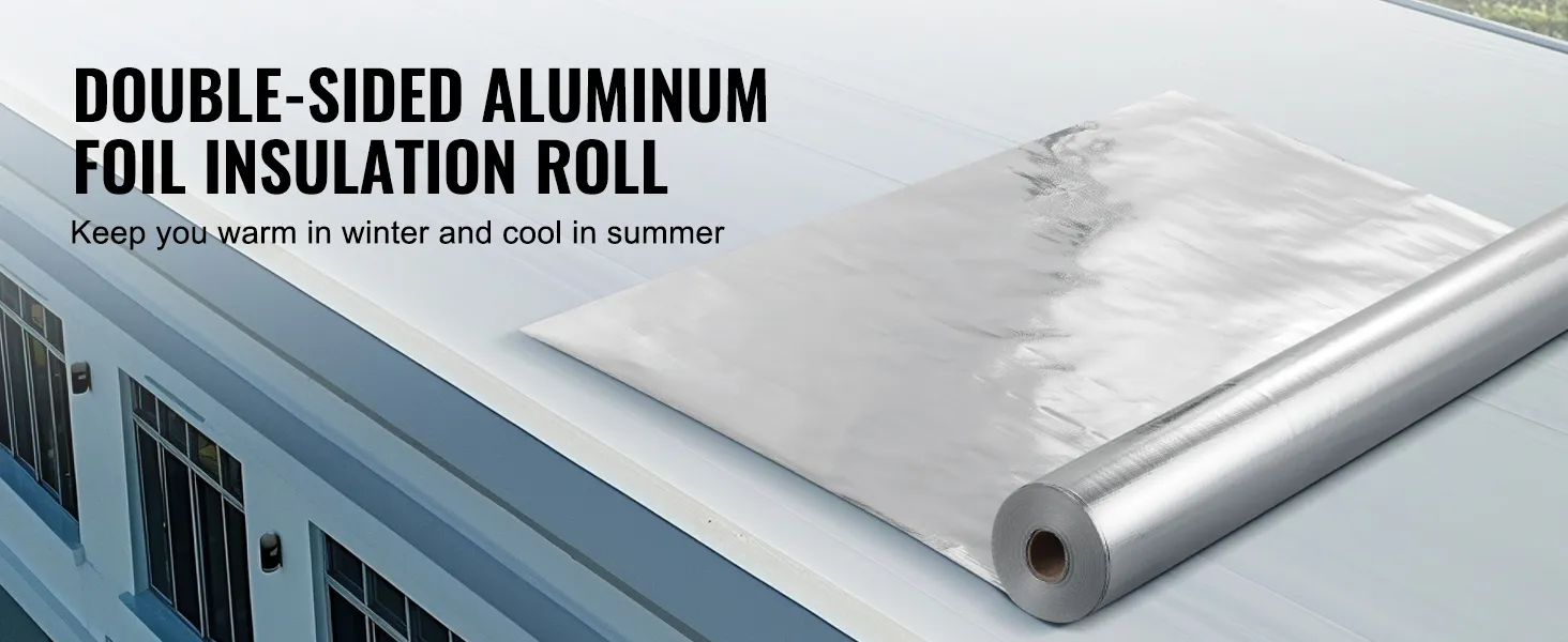 VEVOR Dubbel reflecterende isolatierol, geweven stoffen stralingsbarrière, 6,5 mil, 48 inch x 250 ft, warmtereflecterend schild gemaakt van aluminiumfolie en PE-stof, thermische isolatierol voor ramen en camperdaken