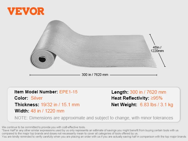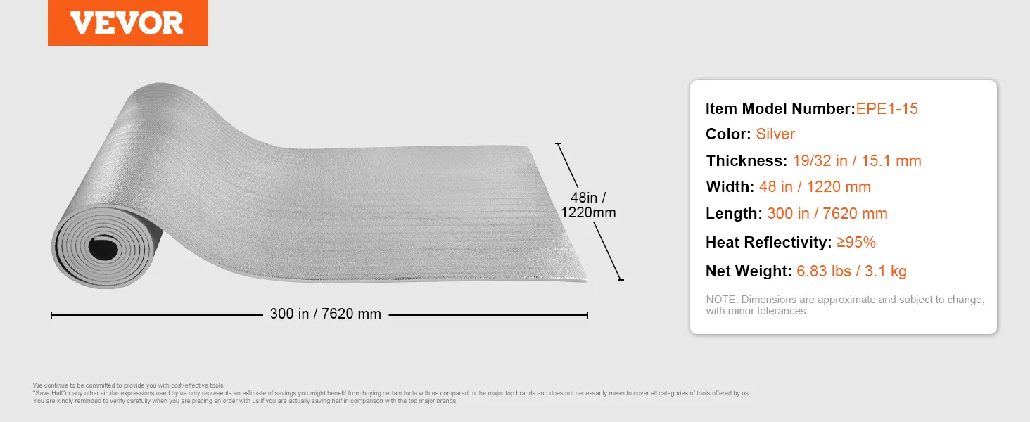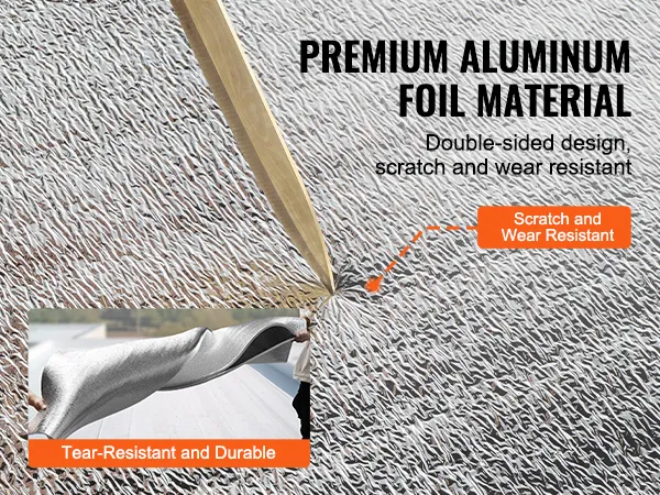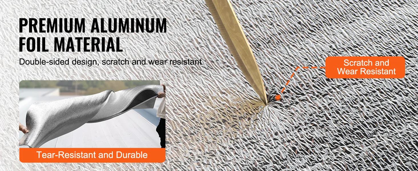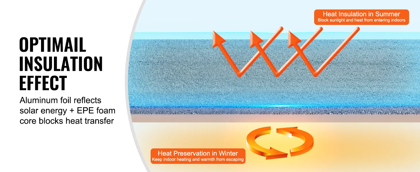 De isolatierol van VEVOR heeft een hoge reflectiviteit van ≥95% en is gemaakt van dubbel reflecterende aluminiumfolie en een kern van EPE-schuim met hoge dichtheid. Het blokkeert effectief zonlicht in de zomer en voorkomt warmteverlies binnenshuis in de winter.