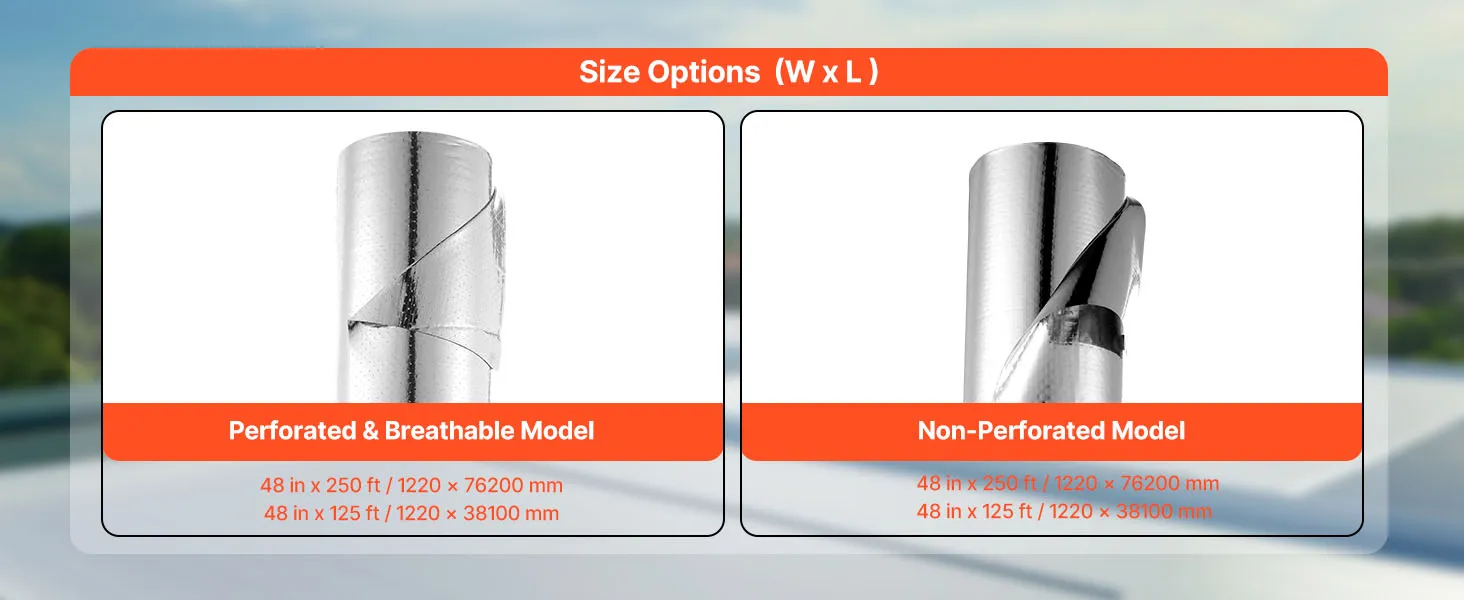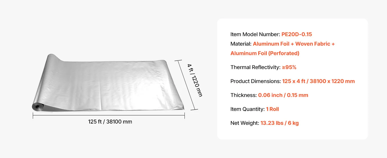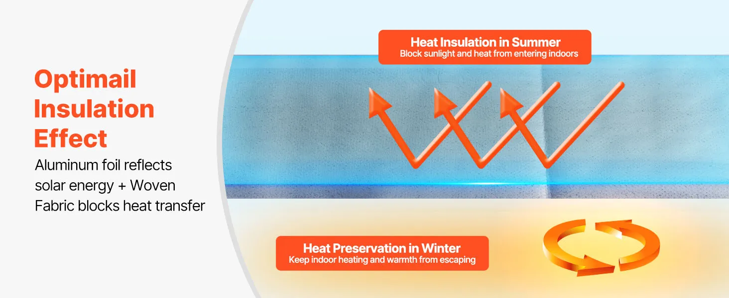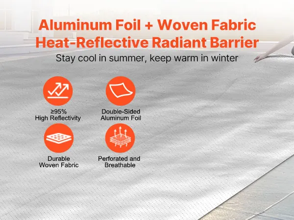 VEVOR double reflective insulation roll features ≥95% high reflectivity, utilizing double reflective aluminum foil and perforated woven fabric. It blocks sunlight in summer while preventing indoor heating loss in winter, maintaining a comfortable indoor temperature.