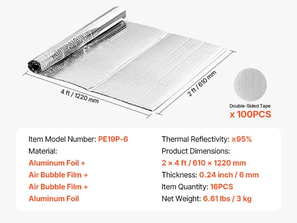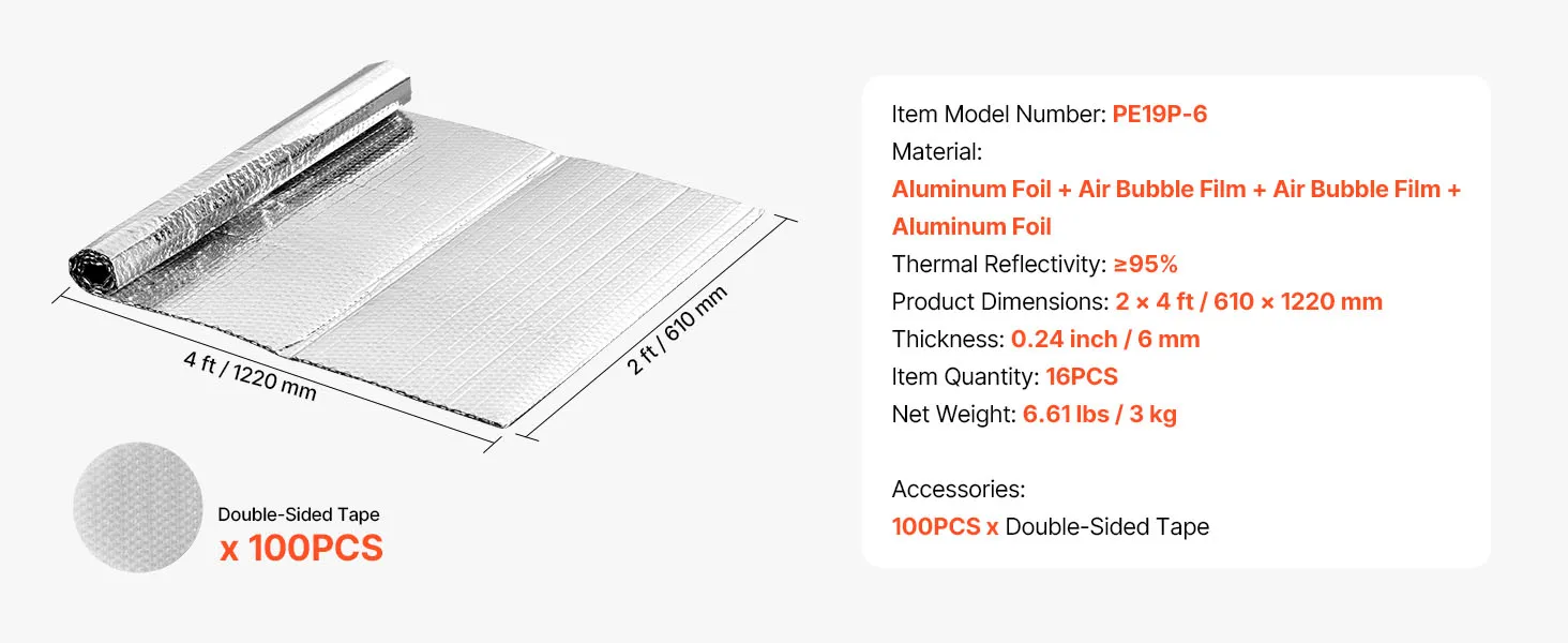 De 16-delige isolatieplaten van VEVOR hebben een hoge reflectie van ≥ 95% en zijn gemaakt van dubbelzijdig aluminiumfolie en dubbellaagse luchtkussens. Ze blokkeren zonlicht in de zomer en voorkomen warmteverlies in de winter, wat zorgt voor een comfortabele binnentemperatuur.