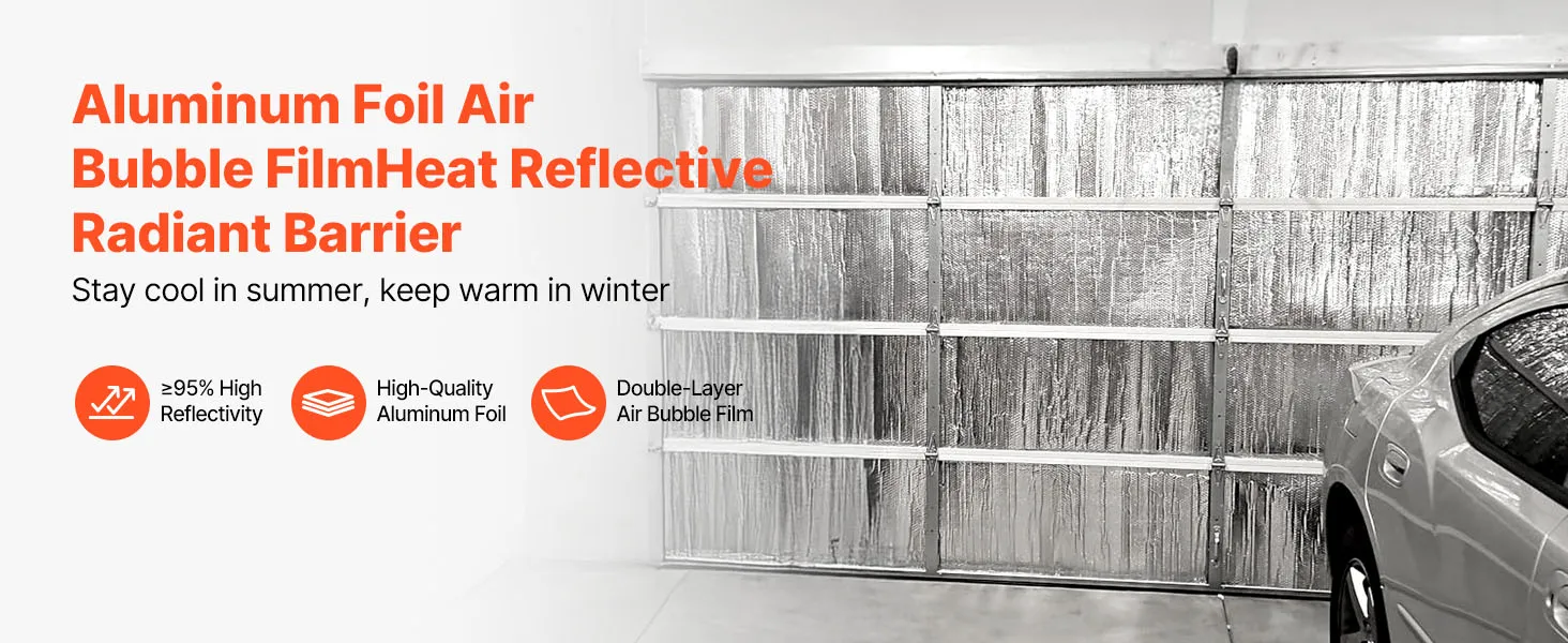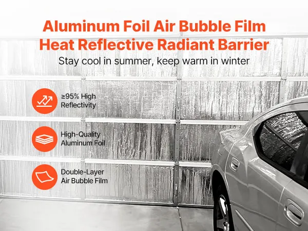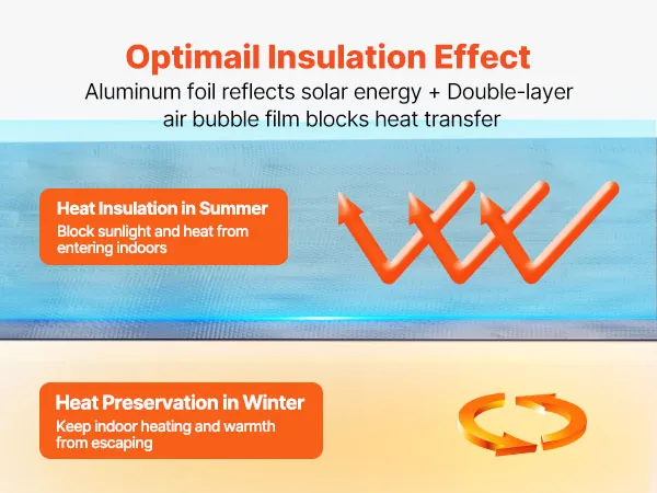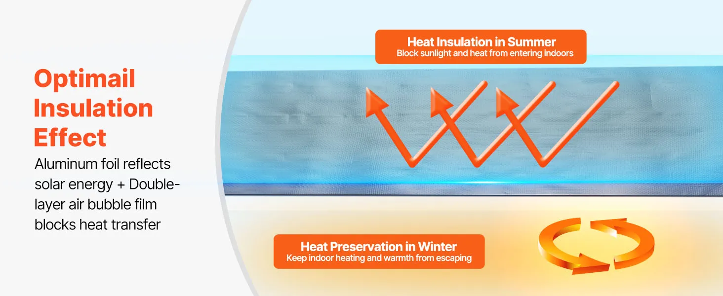 Reflecteert meer dan 95% van de warmte: Deze reflecterende aluminiumfolie met luchtbelletjes reflecteert meer dan 95% van de warmte van de zon en biedt uitstekende warmteblokkering en thermische isolatie.