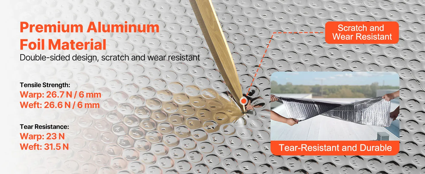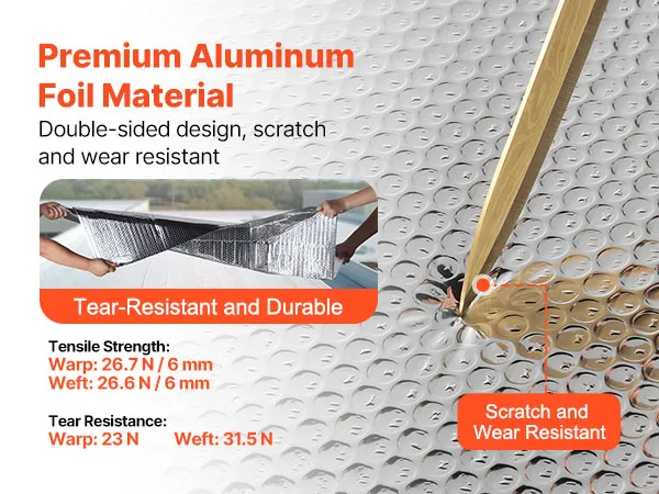 3-in-1 ontwerp: VEVOR's 16-delige reflecterende folie van 1,22 x 60 cm heeft een veelzijdig 3-in-1 ontwerp: stralingsbarrière + isolatie + dampremmende werking voor uitzonderlijke thermische prestaties. De uitstekende stralingsbarrière houdt u koel in de zomer en warm in de winter.