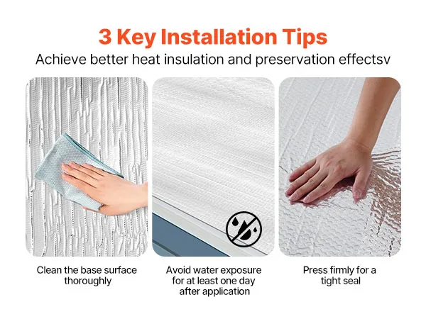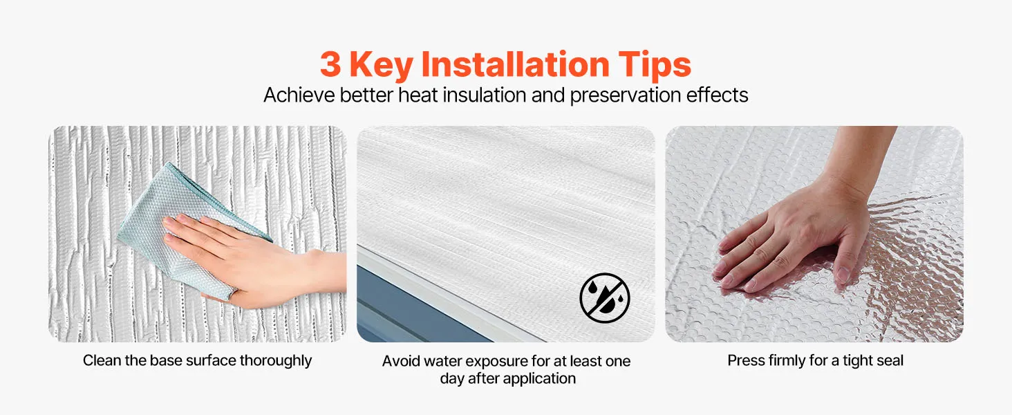 Om de effectiviteit van thermische isolatie te maximaliseren, dient u de volgende drie installatietips te volgen: zorg voor een schoon en droog oppervlak, vermijd blootstelling aan water gedurende ten minste één dag na het aanbrengen en druk stevig aan om een goede afdichting en optimale isolatieprestaties te verkrijgen.