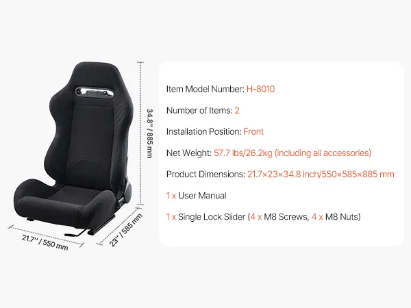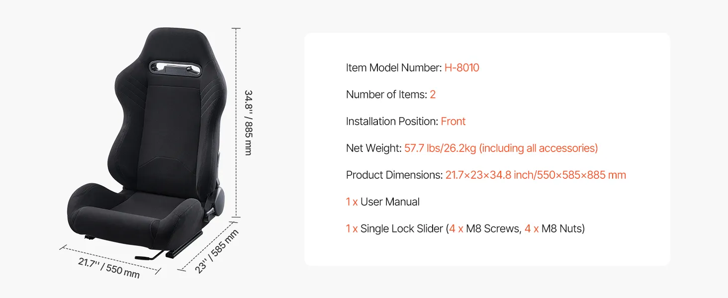 Installatie-opmerking: Onze racestoelen zijn uitgerust met schuifregelaars met enkele vergrendeling voor eenvoudige installatie. Schroef de stoel eenvoudig vast en u bent klaar om te gaan. Wanneer u de originele autostoelen verwijdert, bewaar dan de schroeven die u nodig heeft om de nieuwe stoelen te installeren. Let op: De montagebeugels zijn niet inbegrepen.