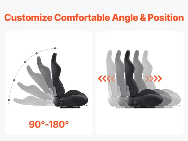 Verstelbaar: Ervaar flexibiliteit met onze racestoelen. Dankzij de verstelbare rugleuning (90°-180°) kunt u uw ideale houding vinden, van rechtop zitten tot liggen of liggen. De stoel schuift ook naar voren en naar achteren, waardoor elke rijder de ideale zitpositie kan vinden voor maximaal comfort.