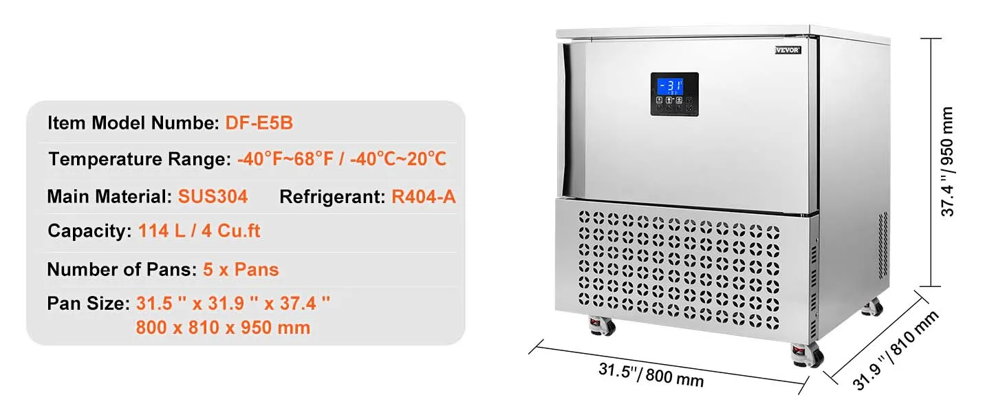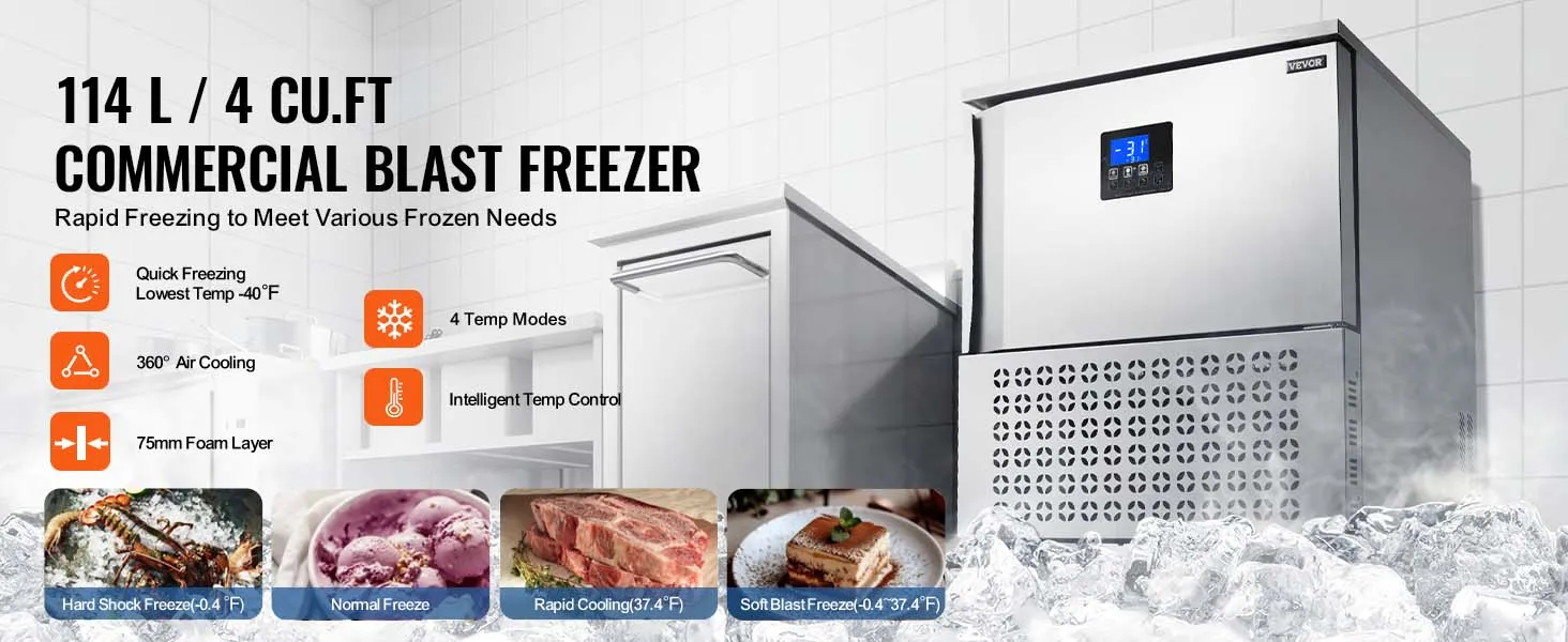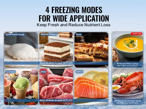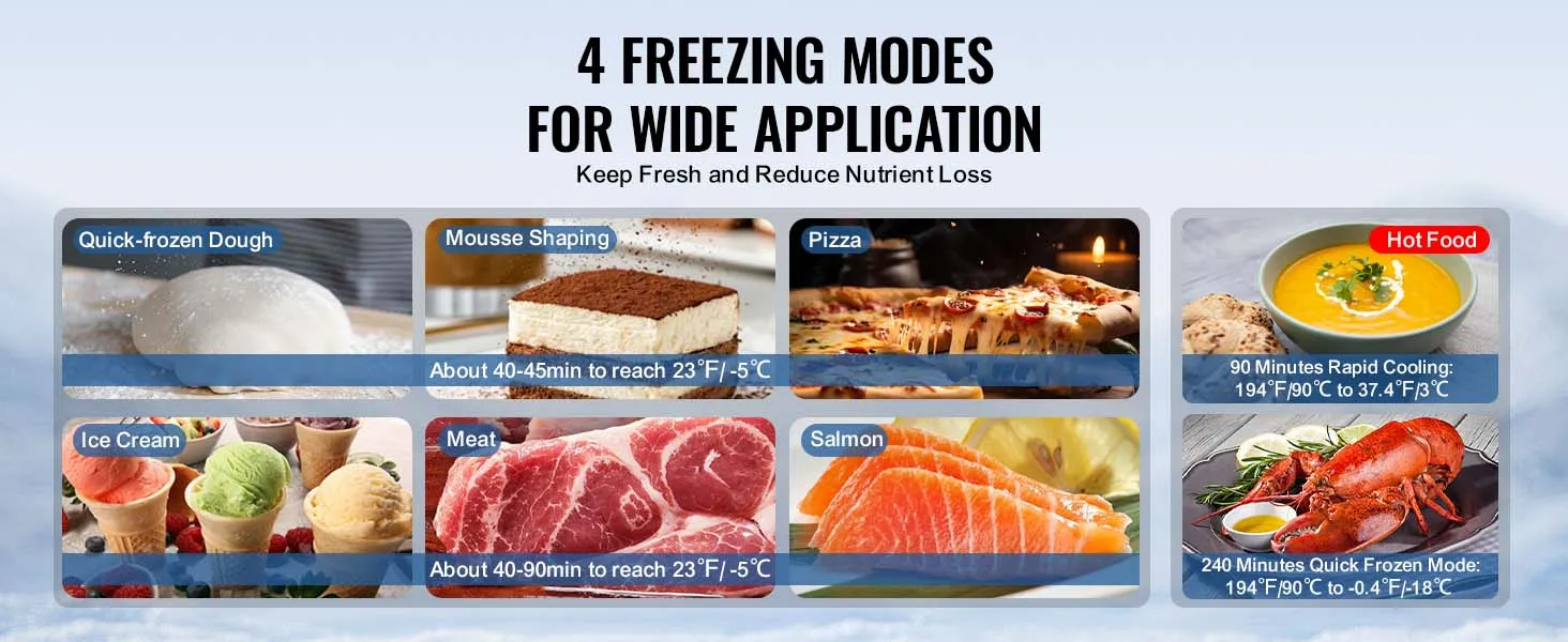 Multiple Modes for Various Ingredients: The blast chiller offers hard chill, freeze, shock freeze, and soft freeze 4 modes, suitable for freezing lobster, salmon, ice cream, cakes, pre-prepared meals, and more. Additional smart features include overload protection, automatic defrosting, precise temperature control, and intelligent alarms, making it easy to use.