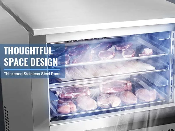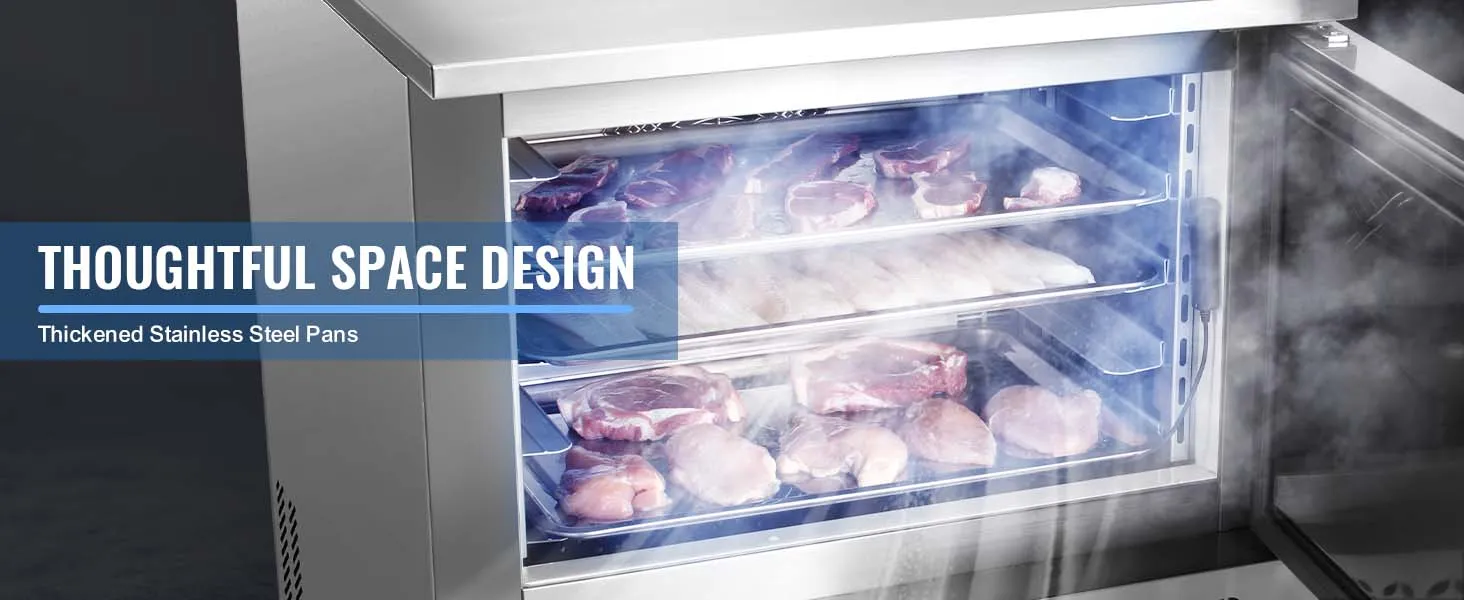 Thoughtful Design: Comes with 5 trays (23.6" x 15.7" x 1.1" / 600 x 400 x 28 mm) that can be removed for easy cleaning. The evaporator and condenser are equipped with noise-reducing fans, resulting in low operational noise. A temperature probe is included to monitor the internal temperature of food.