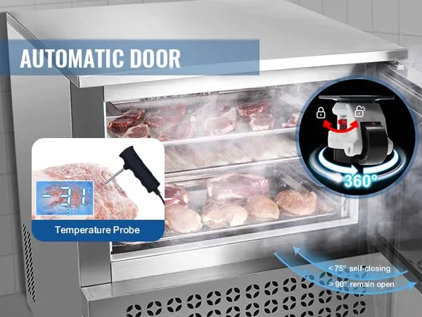 The blast chiller is equipped with a powerful compressor and 360° circulating cold air, hot foods can be quickly reduced from 194℉/90℃ to 37.4℉/3℃ within 90 minutes, and the quick freezing mode can quickly reduce the temperature from 194℉/90℃ to -0.4℉/-18℃ within 240 minutes.