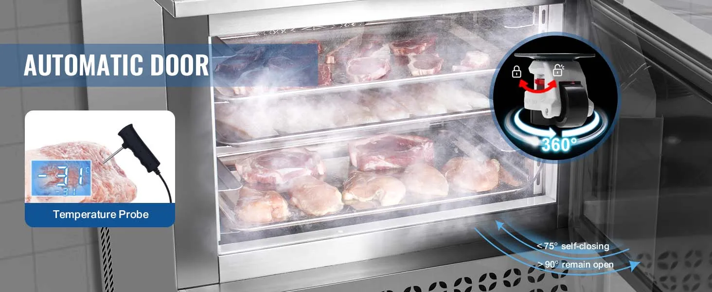 The freezer is equipped with smooth casters for easy mobility. The automatic closing door effectively locks in cold air to prevent loss. The 304 stainless steel enhances insulation, making it sturdy and durable. Additionally, it includes a temperature probe to monitor internal temperatures.