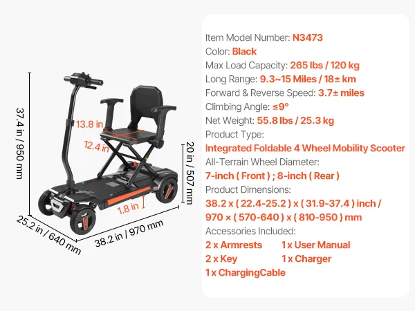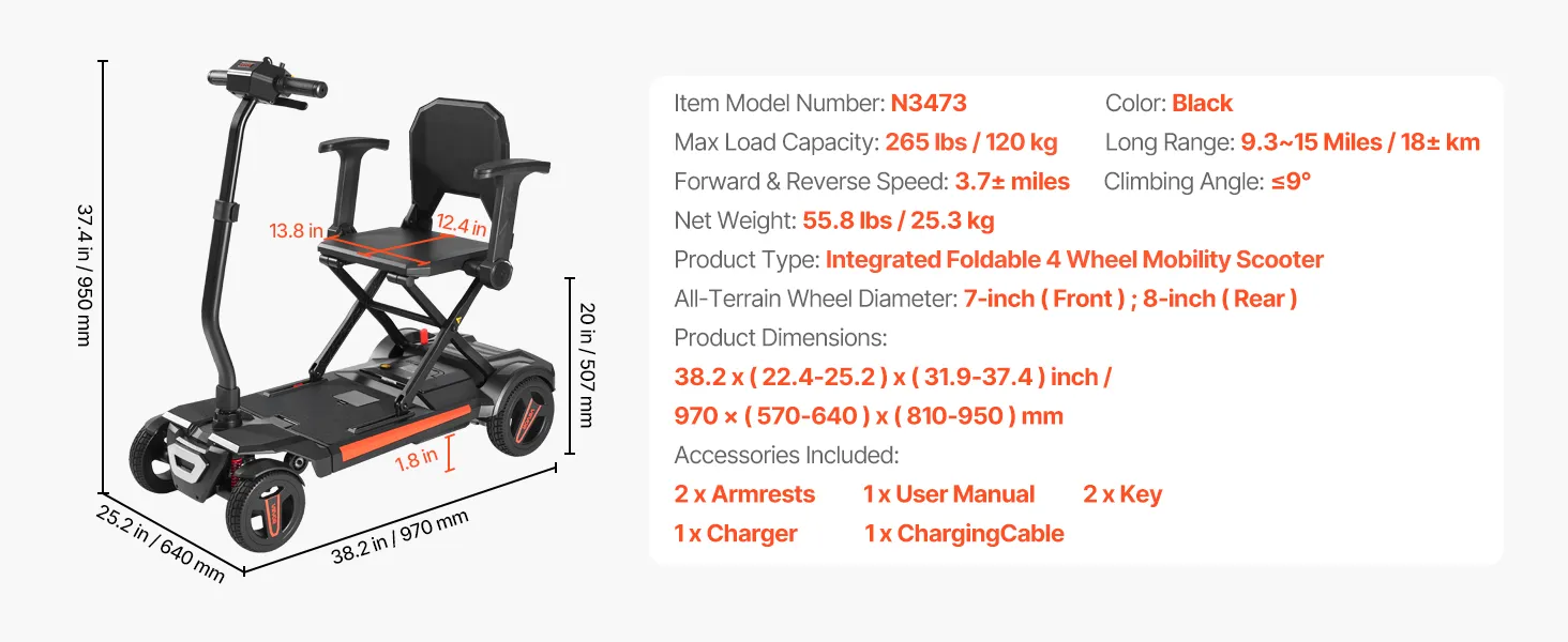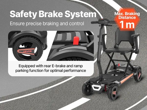 Verbeterde mobiliteit: De geïntegreerde, opvouwbare VEVOR elektrische scooter met 4 wielen heeft een lichtgewicht maar robuust frame van aluminiumlegering dat tot 120 kg kan dragen en een hellingshoek van 9° aankan. Het biedt senioren en mensen met beperkte mobiliteit verbeterde stabiliteit en een soepele rit.