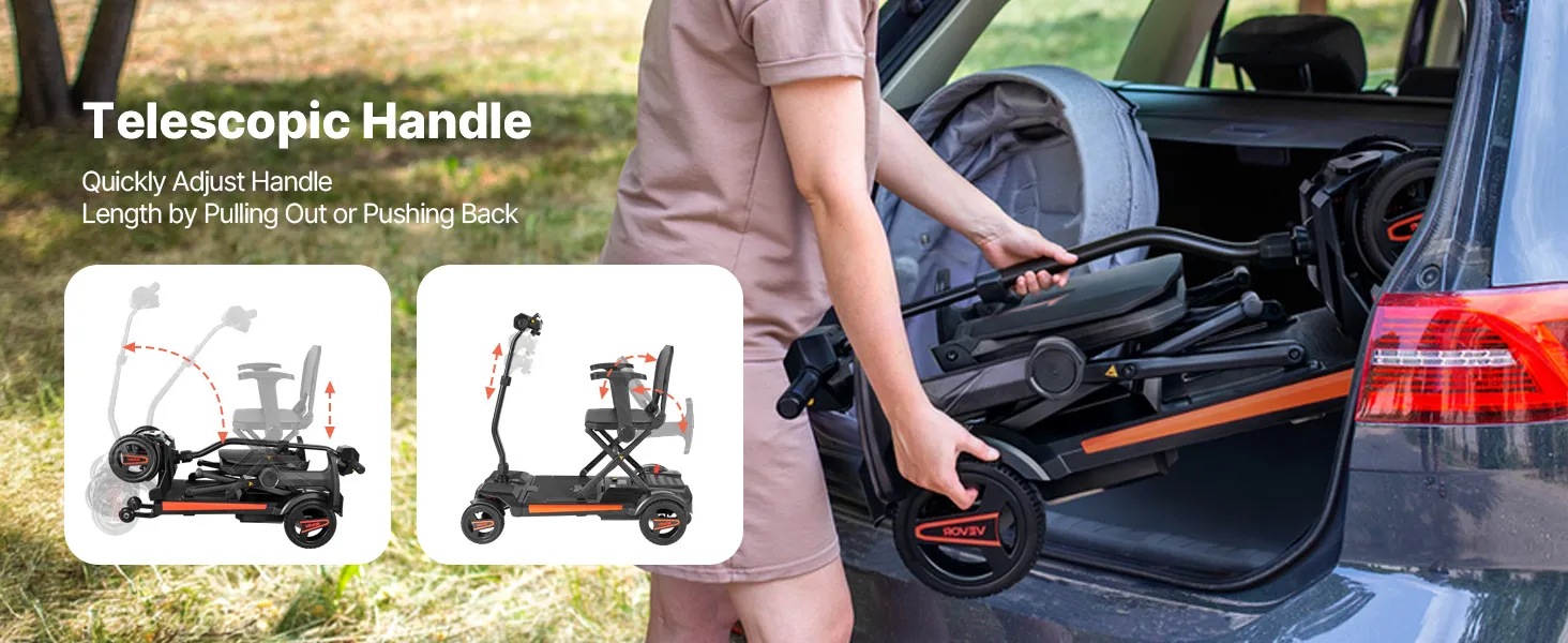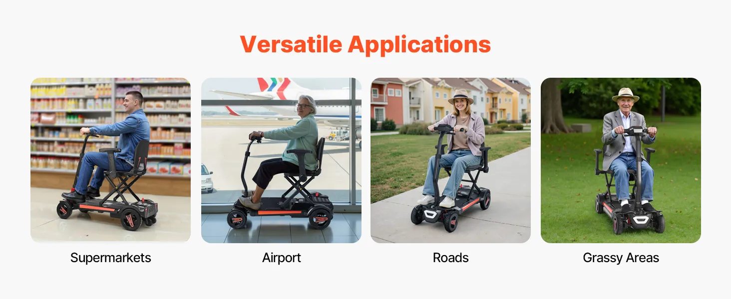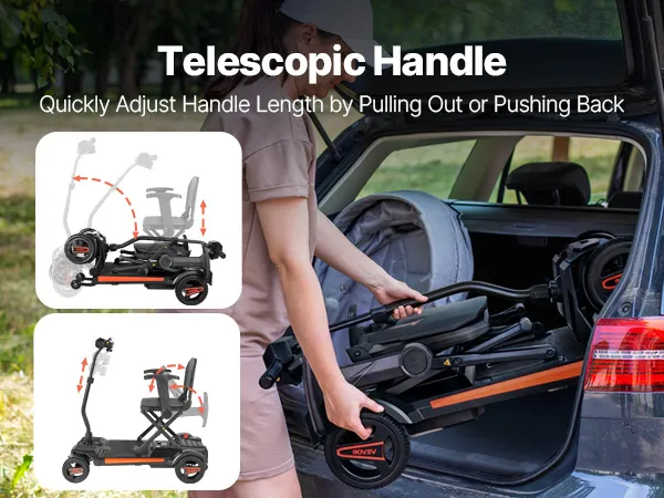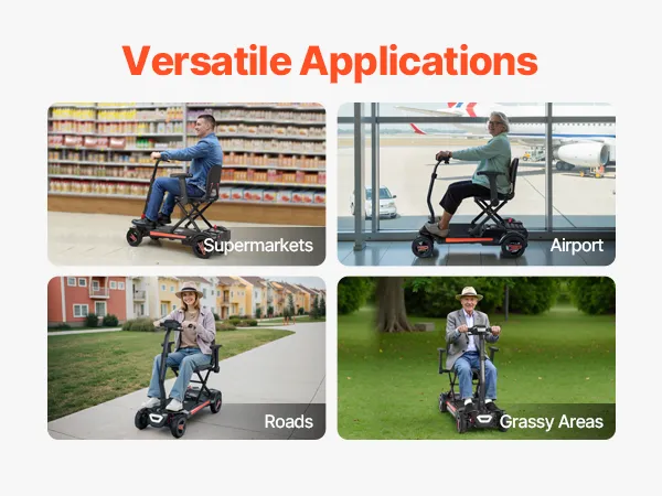Geïntegreerd vouwmechanisme: Onze opvouwbare scootmobiel voor senioren heeft een geïntegreerde X-vormige vouwzitting die eenvoudig tot een compact formaat kan worden opgevouwen voor opslag en transport. Het tweewegvergrendelingssysteem voorkomt onbedoeld losraken, wat stabiliteit en veiligheid garandeert.
