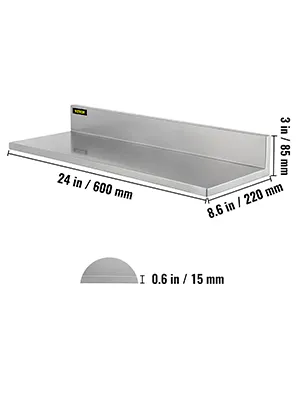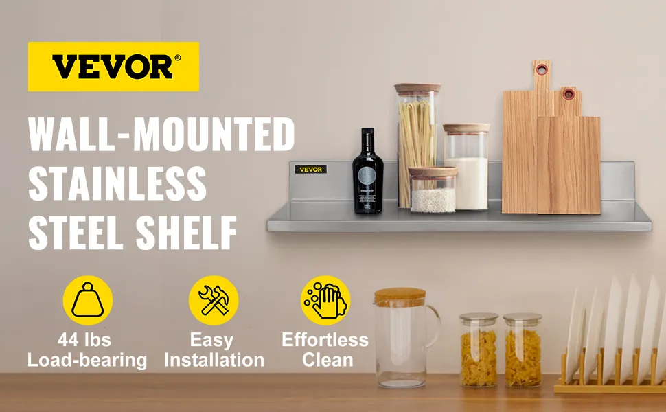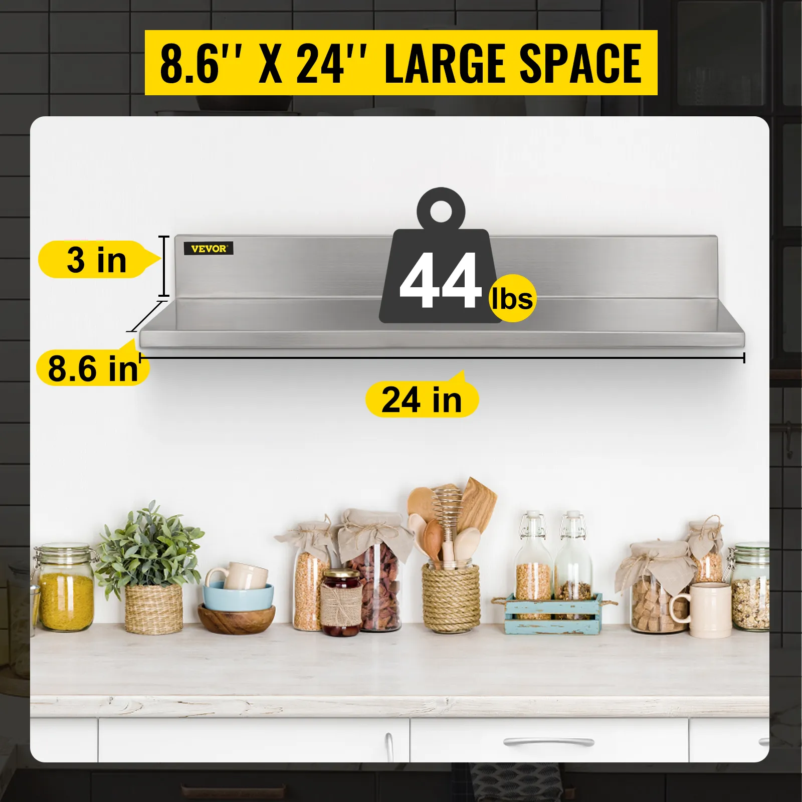 8,6" x 24" Ruime Plank: Als professionele organizer met een grote ruimte van 8,6" B x 24" L (220 mm B x 600 mm L) blinkt onze commerciële keukenwandplank uit in het bewaren van specerijen en zwaardere items in georganiseerd. Het geeft duidelijk weer wat er op de plank ligt, wat u tijd bespaart en snelle toegang biedt. Heavy-duty tot 44 lbs (20 kg) laadvermogen.