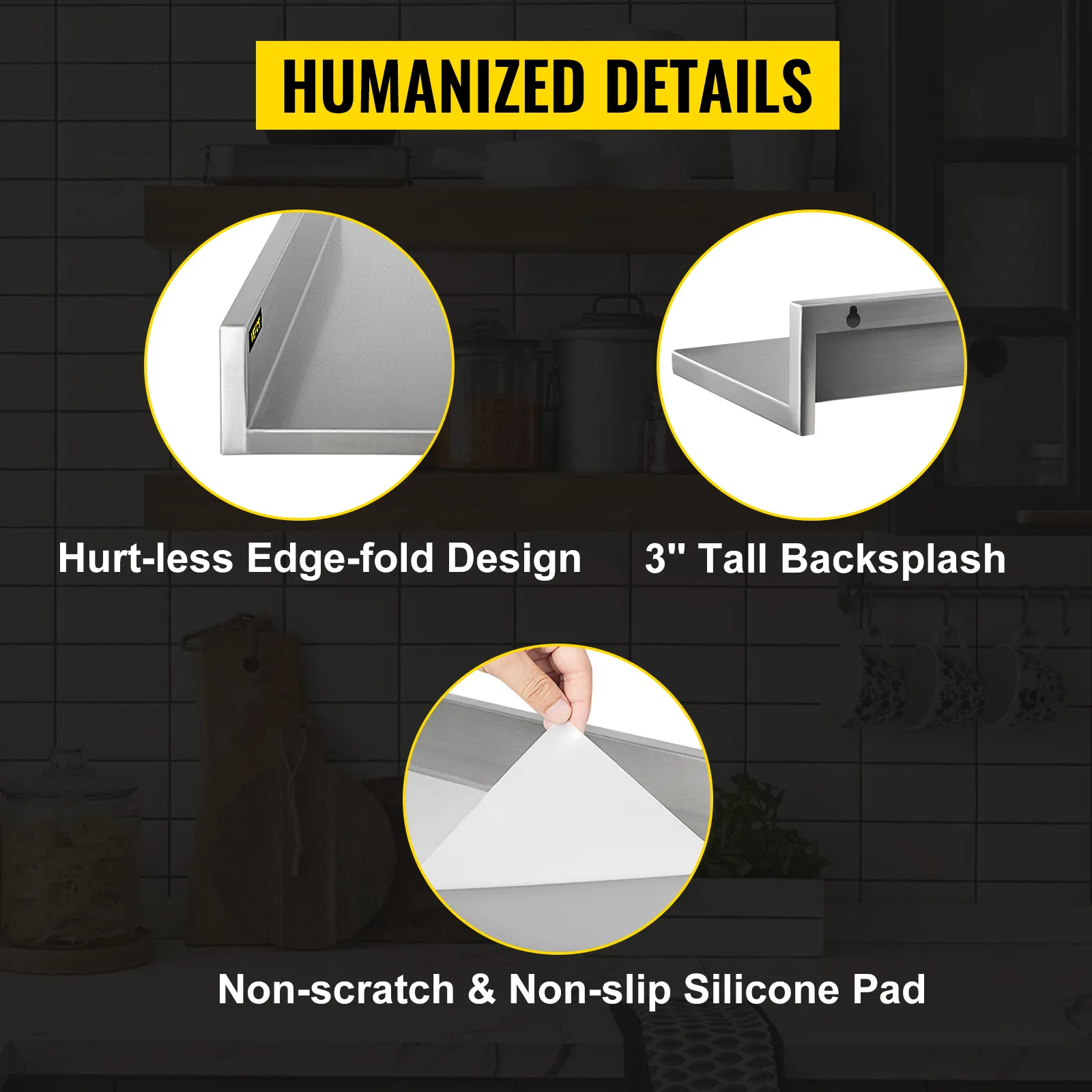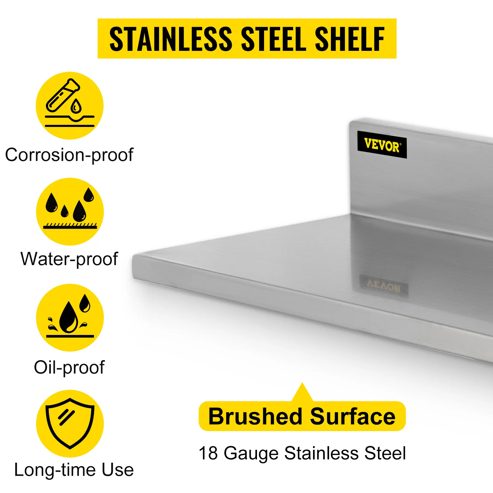 Massief Roestvrij Staal: Ons eersteklas roestvrij staal van 18 gauge heeft een fijn gepolijst geborsteld glad oppervlak, waardoor de keukenwandplank roestvrij staal corrosiebestendig, waterdicht en oliebestendig is. Geschikt om jarenlang te gebruiken.