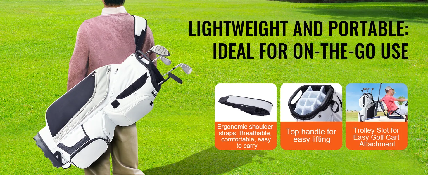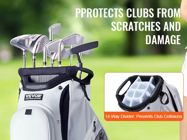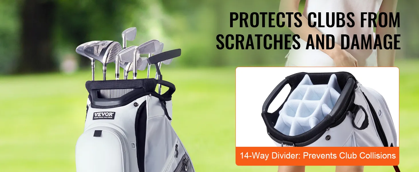 Perfect Protection for Your Clubs: Want to give your clubs better protection and avoid the clanging noise from collisions? Our golf bag features a 14-way divider system, suitable for 35-45'' clubs, keeping them securely placed in individual compartments. With thickened sponge protection, it prevents clubs from colliding and causing scratches or damage.
