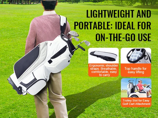 Comfortable, Portable, and Dustproof: Our golf bag comes with ergonomic shoulder straps that are comfortable, breathable, and lightweight, making it easy to carry. The top handle allows for easy lifting, and the bag can be securely fixed on a golf cart for convenient mobility on the course. The dust cover protects the bottom of your clubs, keeping them clean from dirt and dust.