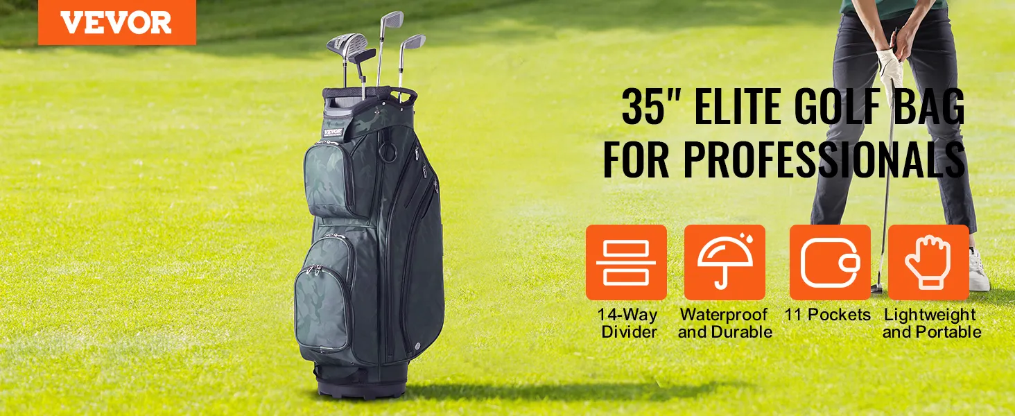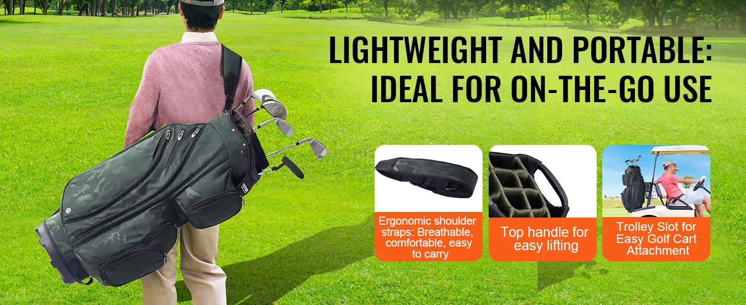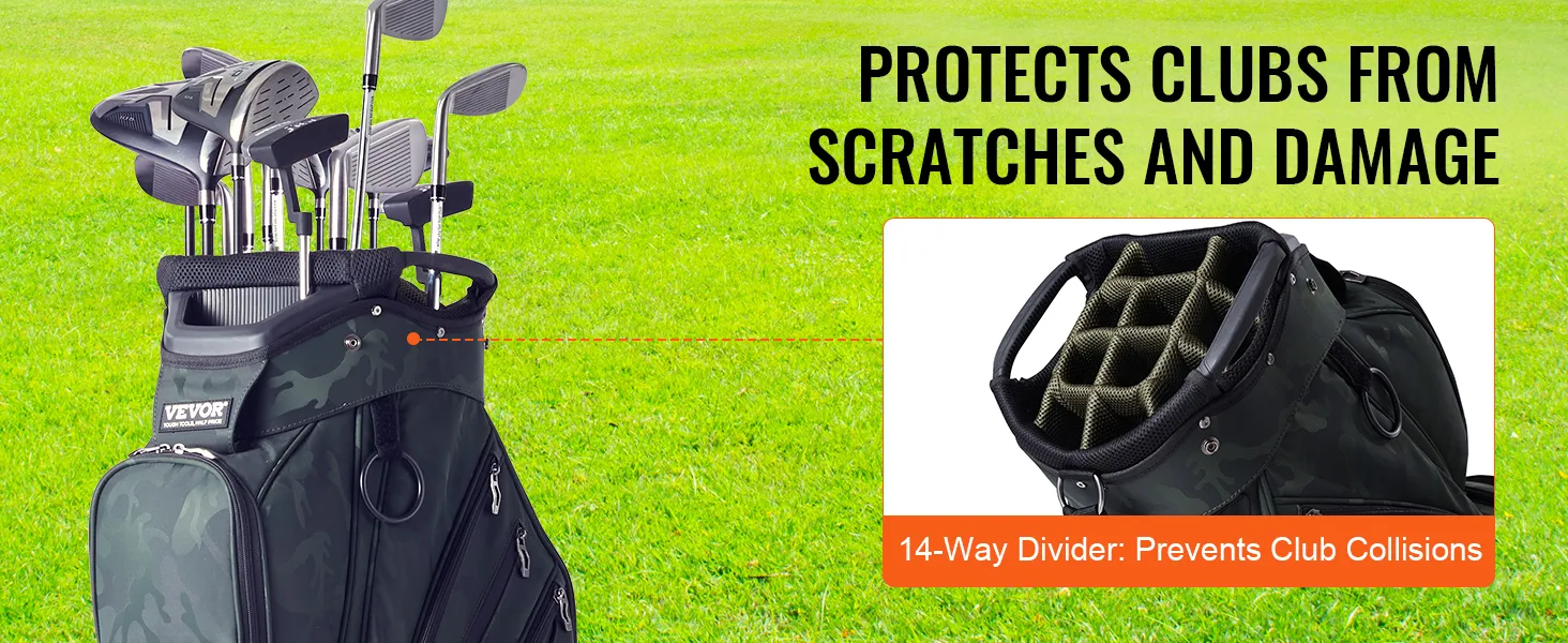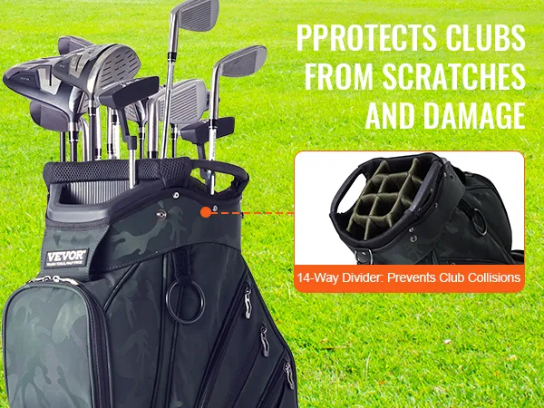 Perfect Protection for Your Clubs: Want to give your clubs better protection and avoid the clanging noise from collisions? Our golf bag features a 14-way divider system, suitable for 35-45'' clubs, keeping them securely placed in individual compartments. With thickened sponge protection, it prevents clubs from colliding and causing scratches or damage.