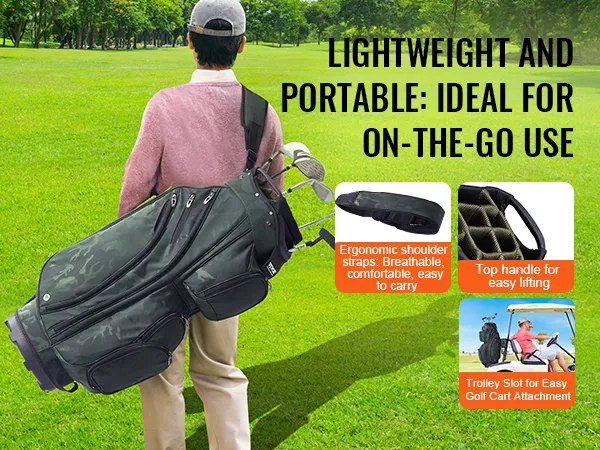 Comfortable, Portable, and Dustproof: Our golf bag comes with ergonomic shoulder straps that are comfortable, breathable, and lightweight, making it easy to carry. The top handle allows for easy lifting, and the bag can be securely fixed on a golf cart for convenient mobility on the course. The dust cover protects the bottom of your clubs, keeping them clean from dirt and dust.