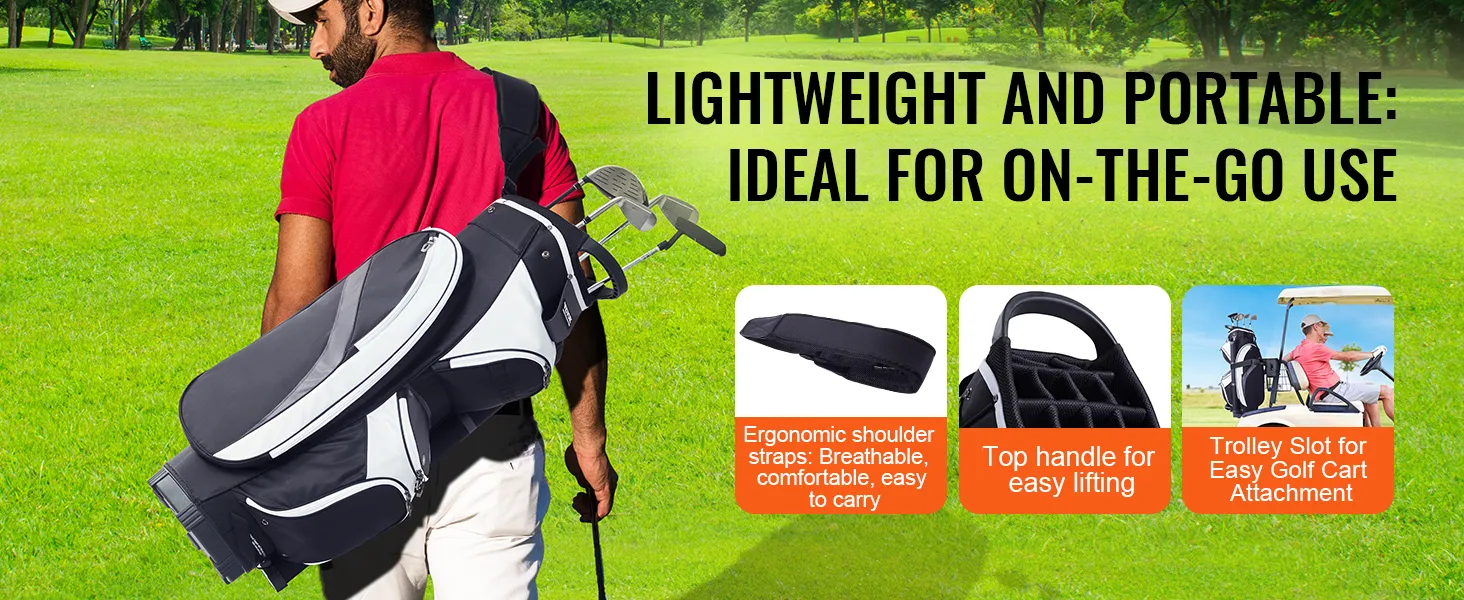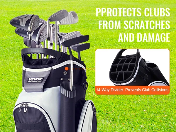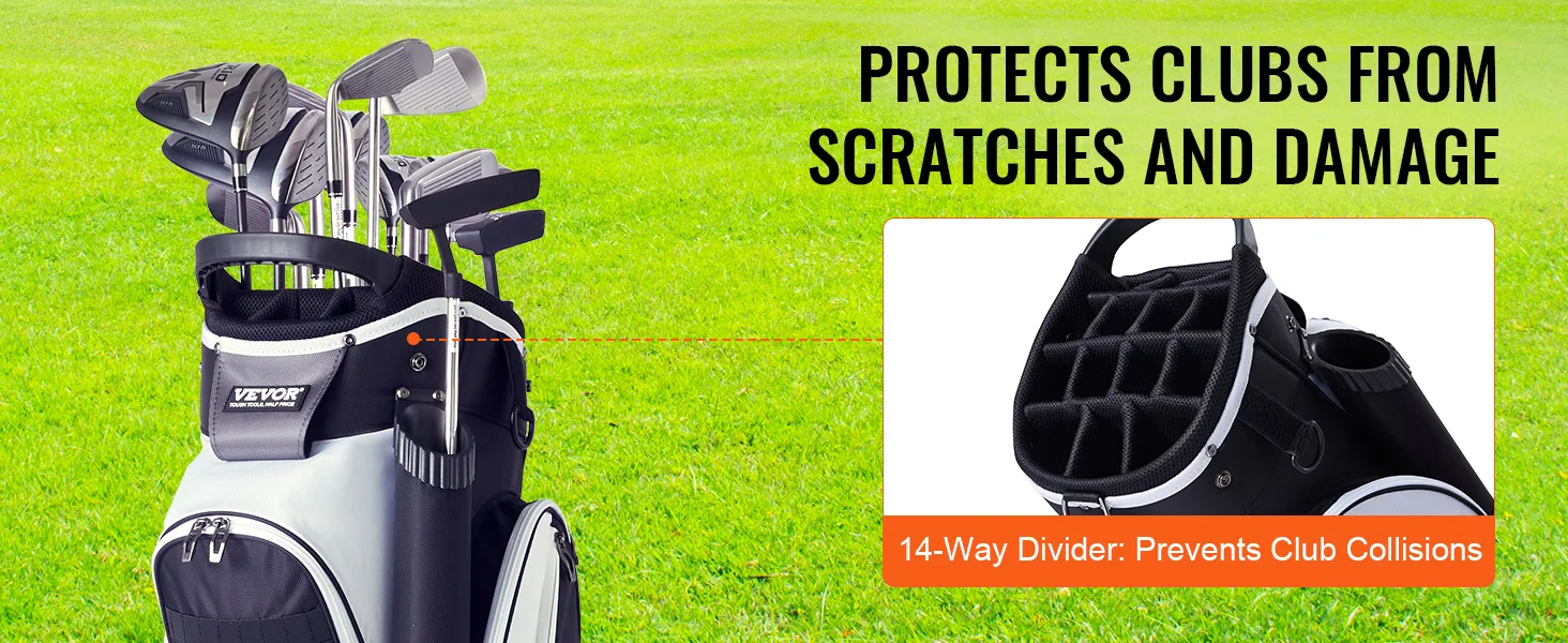 Perfect Protection for Your Clubs: Want to give your clubs better protection and avoid the clanging noise from collisions? Our golf bag features a 14-way divider system, suitable for 35-45'' clubs, keeping them securely placed in individual compartments. With thickened sponge protection, it prevents clubs from colliding and causing scratches or damage.