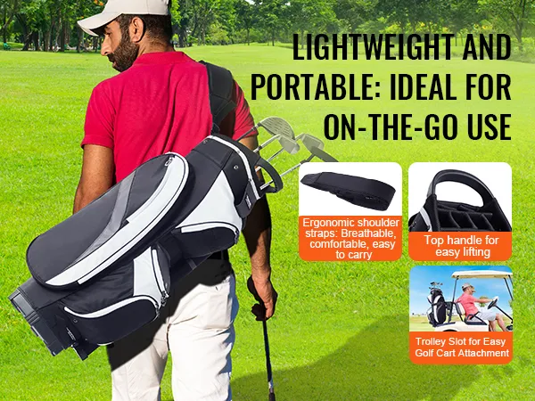 Comfortable, Portable, and Dustproof: Our golf bag comes with ergonomic shoulder straps that are comfortable, breathable, and lightweight, making it easy to carry. The top handle allows for easy lifting, and the bag can be securely fixed on a golf cart for convenient mobility on the course. The dust cover protects the bottom of your clubs, keeping them clean from dirt and dust.