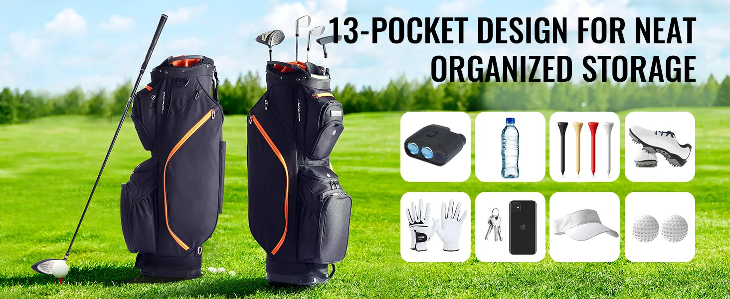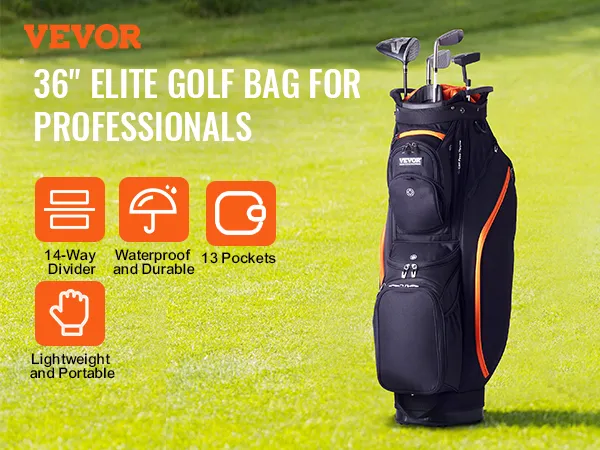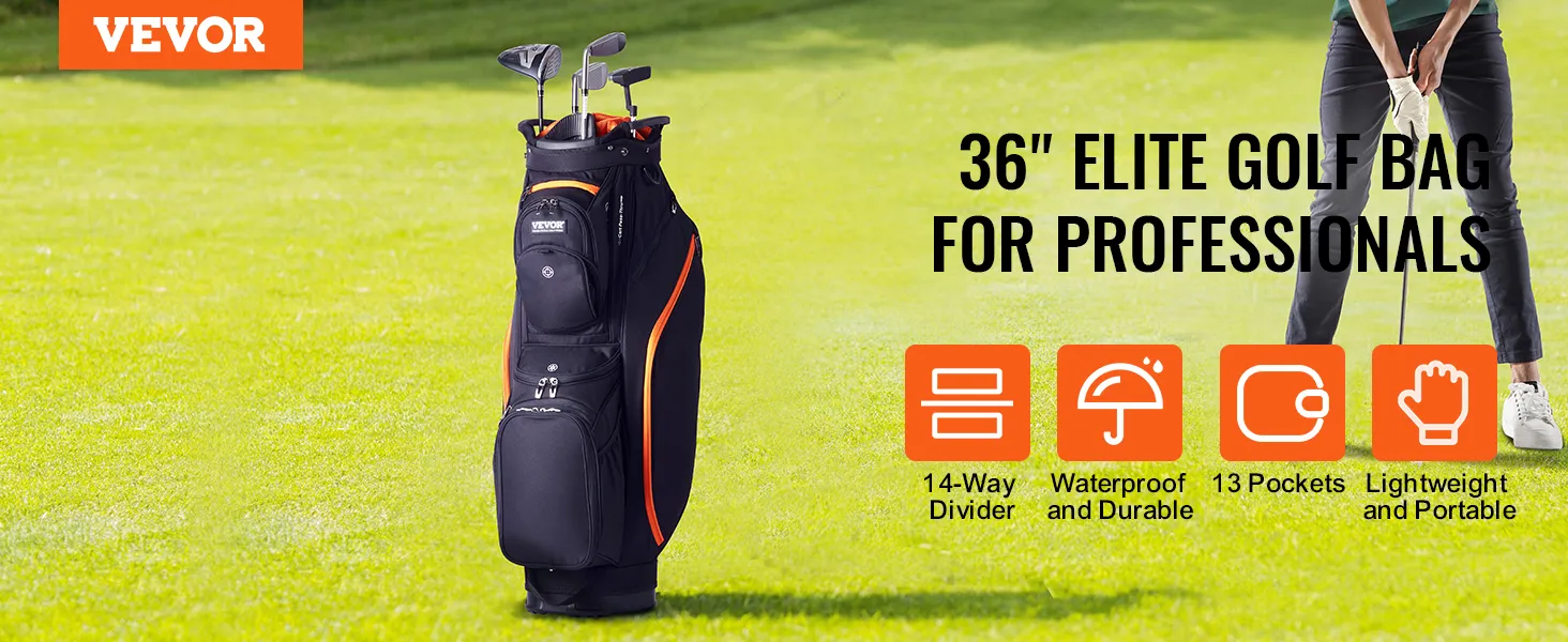 VEVOR Golf Cart Bag with 14 Way Organizer Divider Top, 36” 13 Pockets Premium Cart Bag, Durable Golf Bags with Handles & Dust Cover & Detachable Straps for Men & Women, Black & Orange