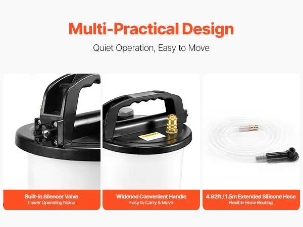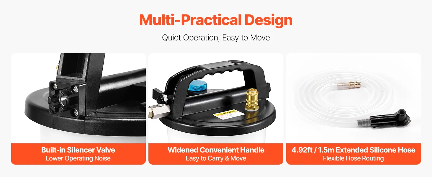The brake fluid changer includes a built-in silencer valve to lower noise during operation. It also features a convenient carrying handle for easy movement between wheels, and a 4.92ft extended hose for flexible and convenient setup.