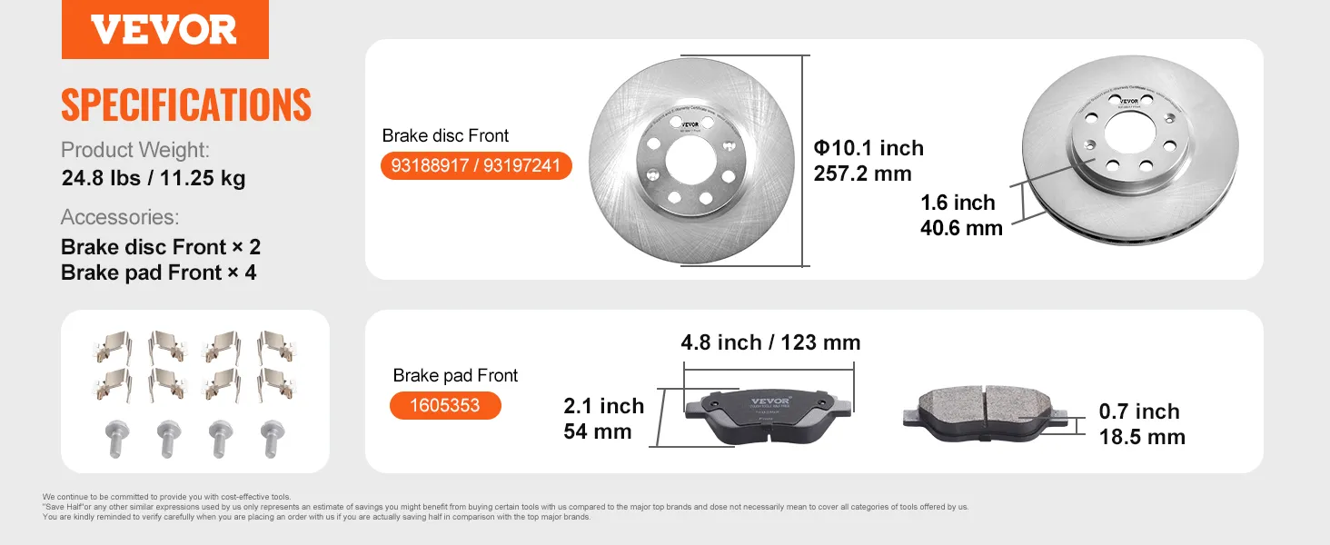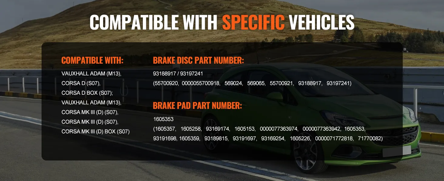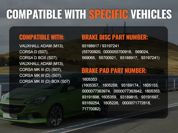 Voertuigcompatibiliteit: de complete voorremset bestaat uit 2 voorwielschijven en 4 voorwielremblokken. De diameter van de voorwielschijf is 10,1 inch (257 mm). Geschikt voor Opel Adam (M13), Corsa D (S07), Corsa D hatchback/sedan (S07).